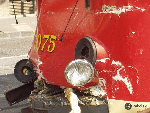 Čelo električky K2 #7075 po nehode s kamiónom na prejazde cez trať pri Figare.
