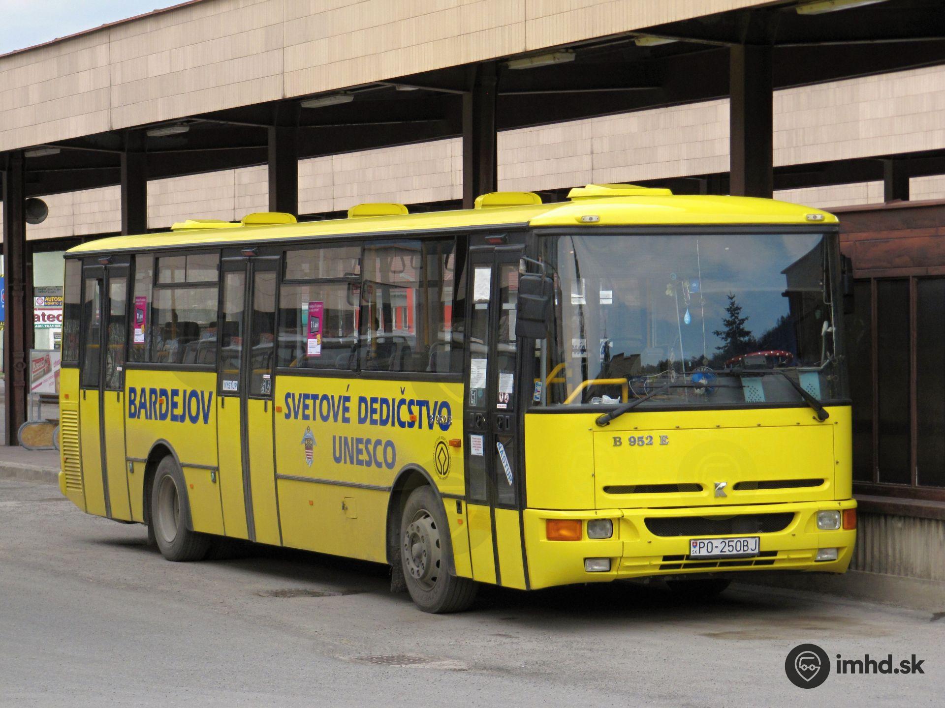 Jediná bardejovská Karosa B 952E #PO-250BJ trávi prestávku v priestore autobusovej stanice.