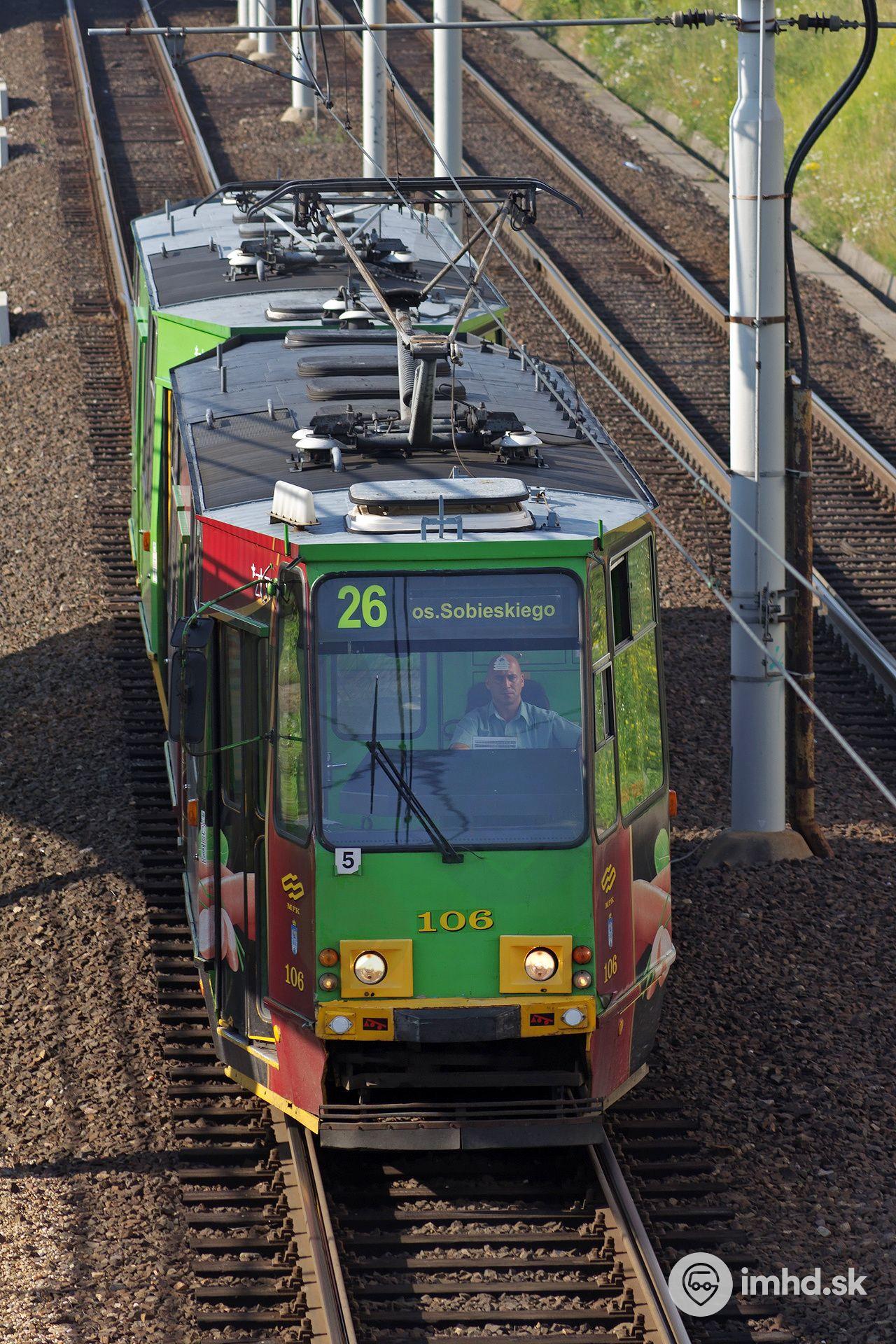 Súprava električiek na čele s Konstal 105Na #106 na linke 26 prechádza poznaňskou rýchlodráhou ku konečnej Osiedle Sobieskiego.