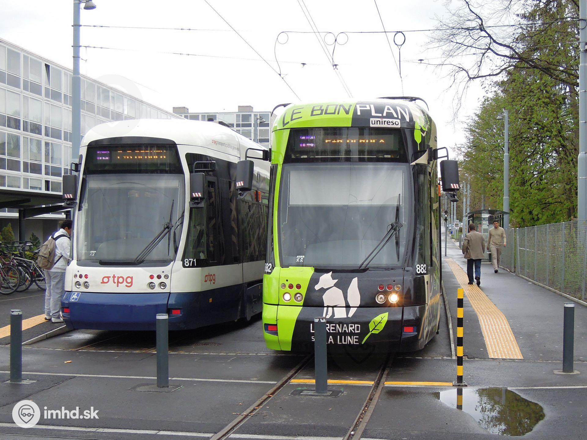 Dvojica Bombardierov Cityrunner #871 a #882 sa stretla na konečnej Meyrin-Gravière.