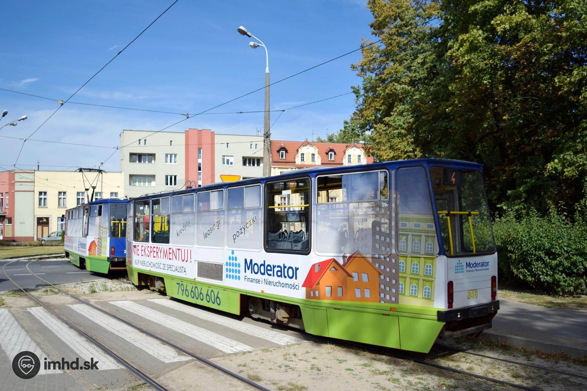 Súprava Konstalov 805Na s celovozidlovou reklamou odchádza zo zastávky Zbożowy Rynek.