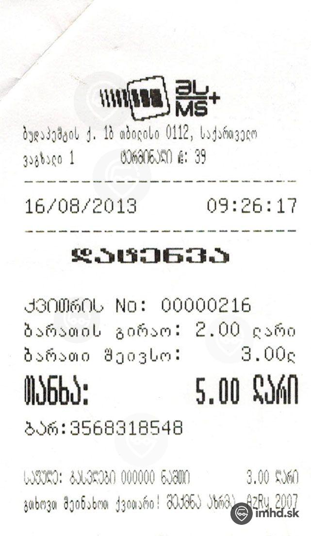 Potvrdenie o zakúpení karty a jej dobití sumou 3 Lari.