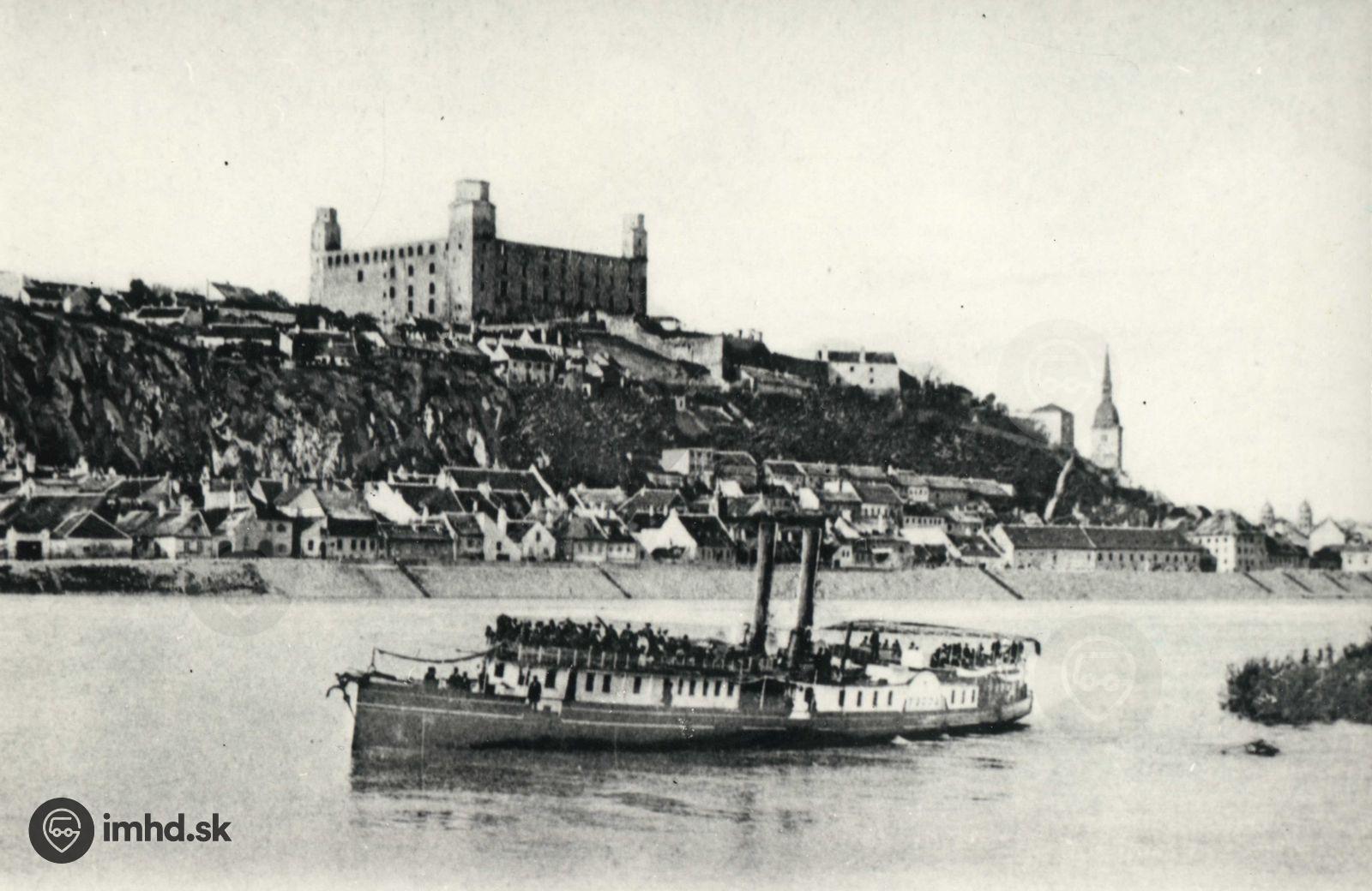 Parník na Dunaji a za Dunajom podhradie zvané aj Zuckermandel.