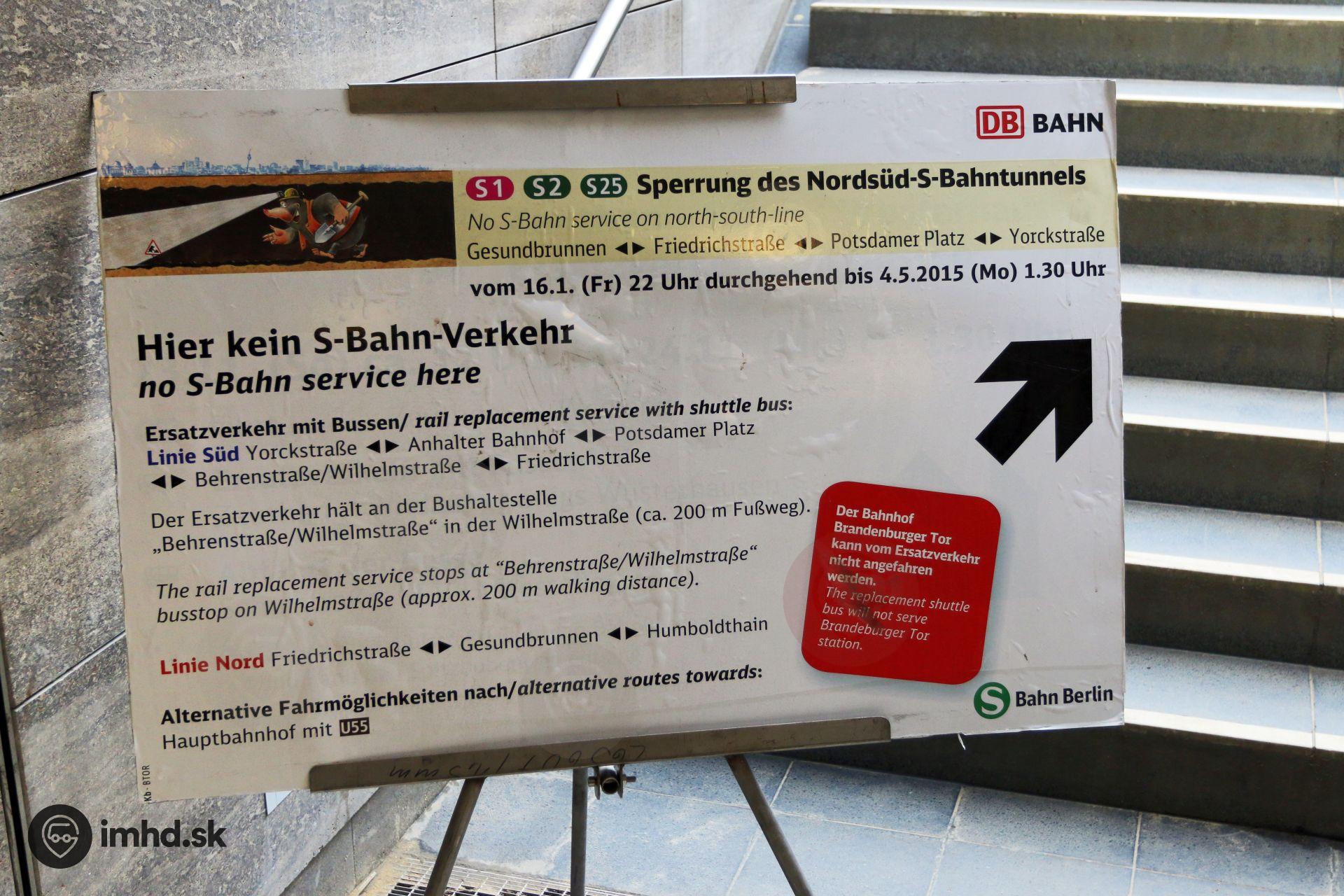 Informácia o výluke S-Bahnu umiestnená pri východe zo stanice Brandenburger Tor.