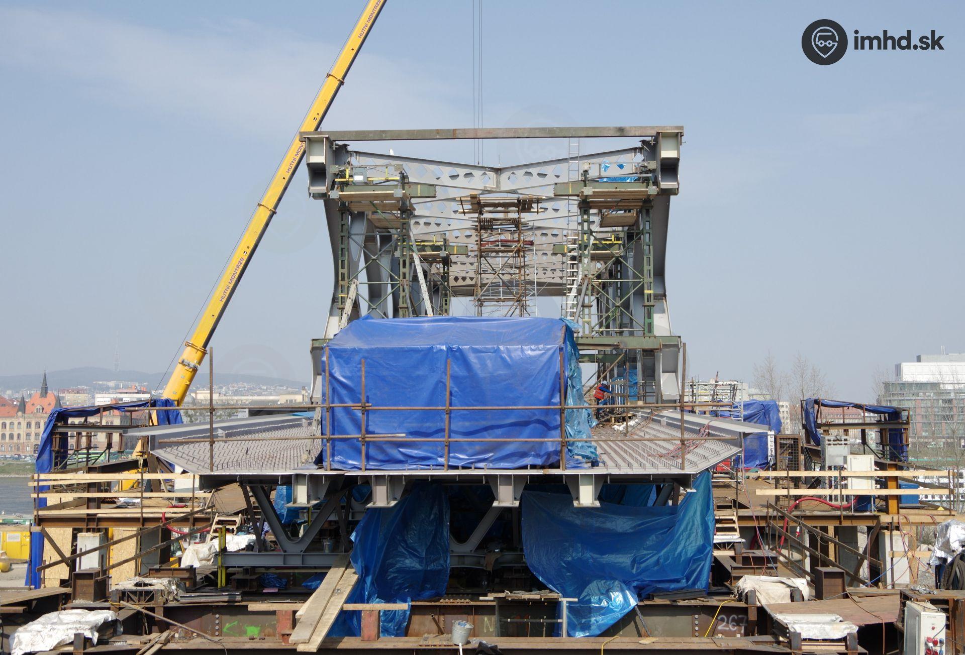 Oceľová konštrukcia mosta počas montáže, v popredí mostovka štvrtého segmentu