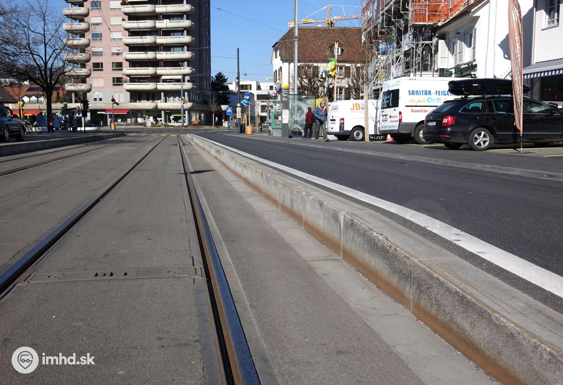 Pojazďovaný zastávkový mys ("zastávka viedenského typu") v Bazileji má pomerne vysoké nástupište. Ako je možné vidieť na bokoch obrubníka, niektorí vodiči sa snažili dostať na cestu z električkovej trate.