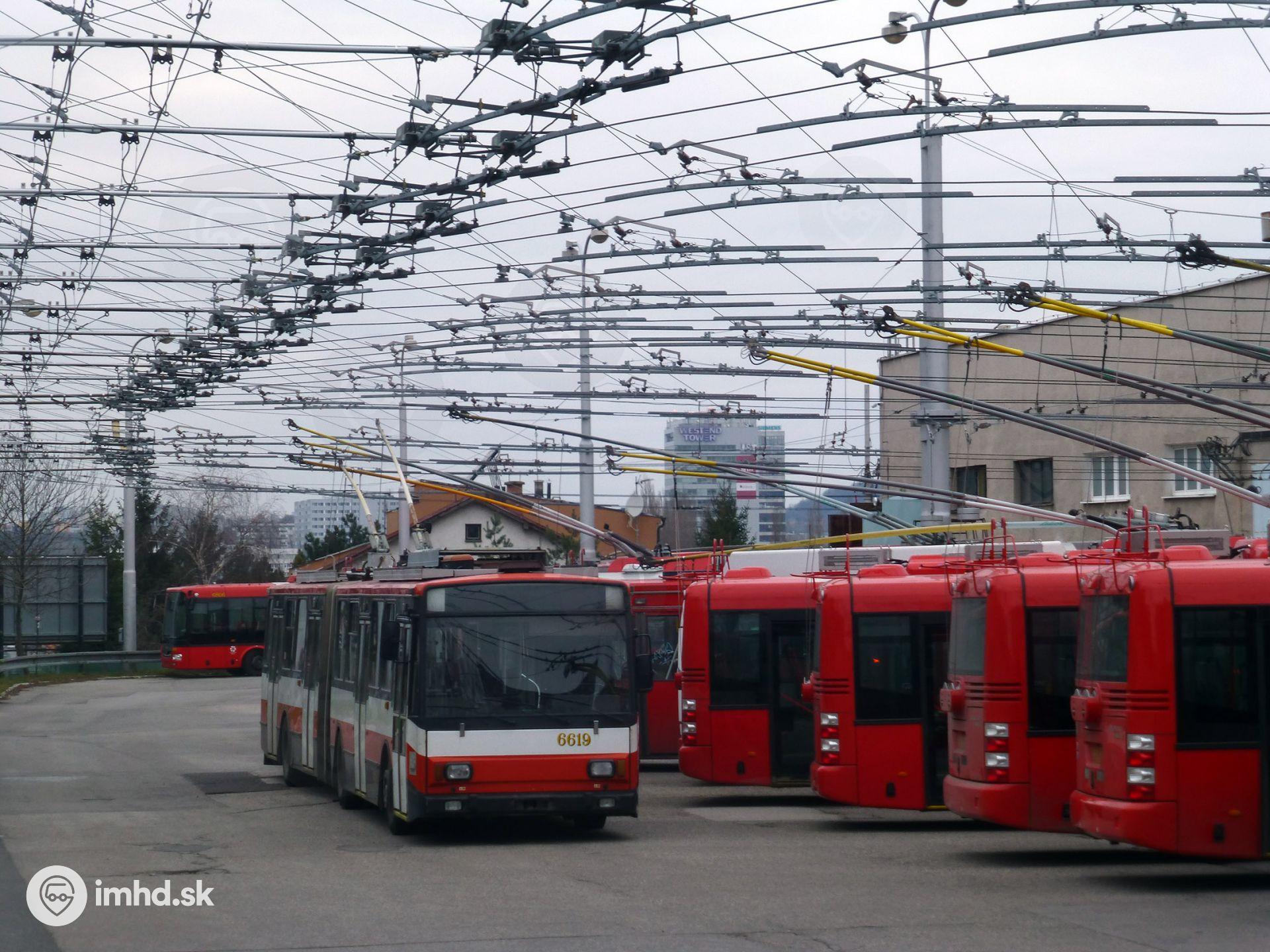 Škoda 15 Tr #6619 obklopená novými trolejbusmi. | |