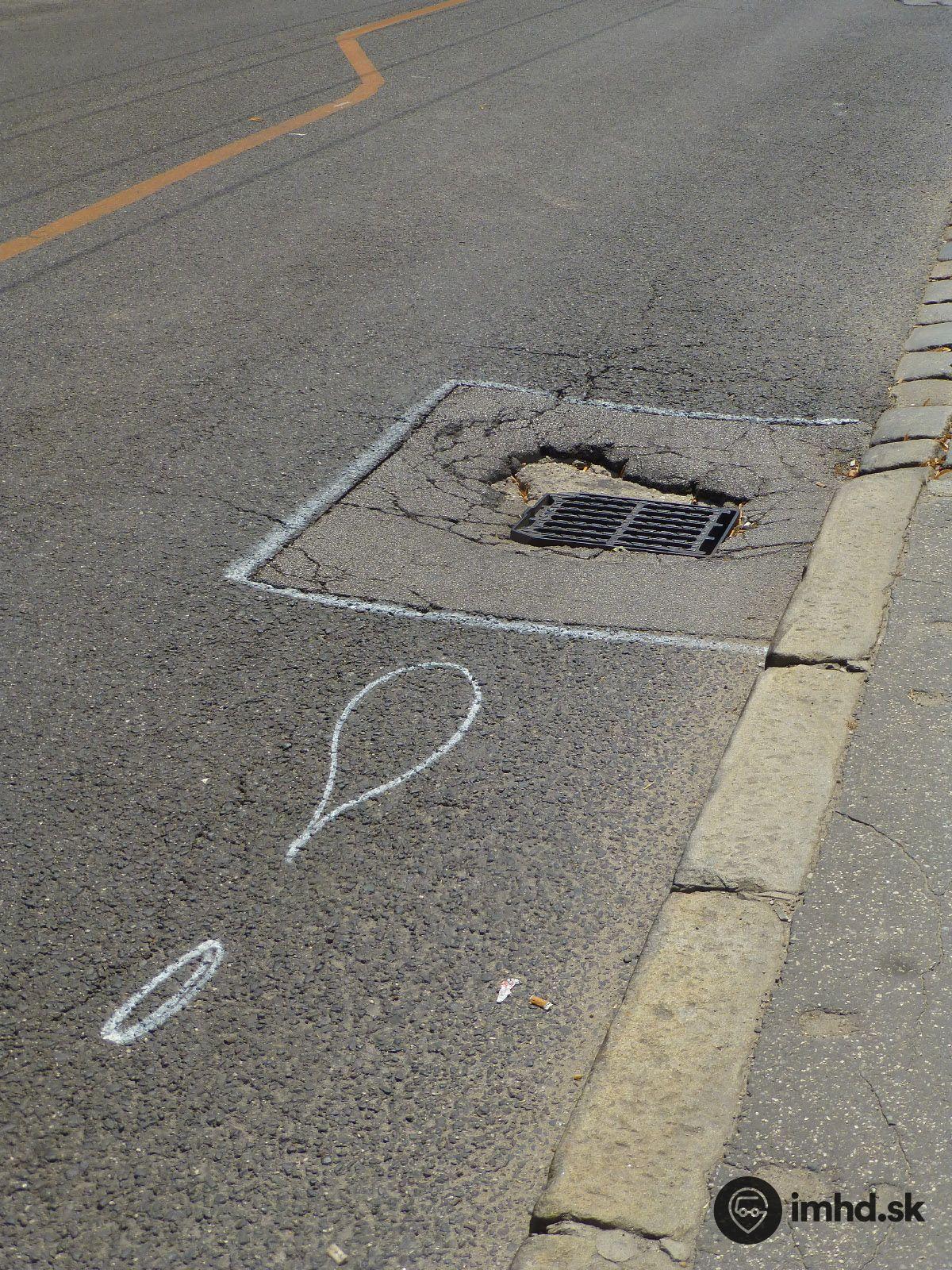 Upozornenie na poškodenú vozovku na Karpatskej ul. pred zastávkou trolejbusu Šancová.