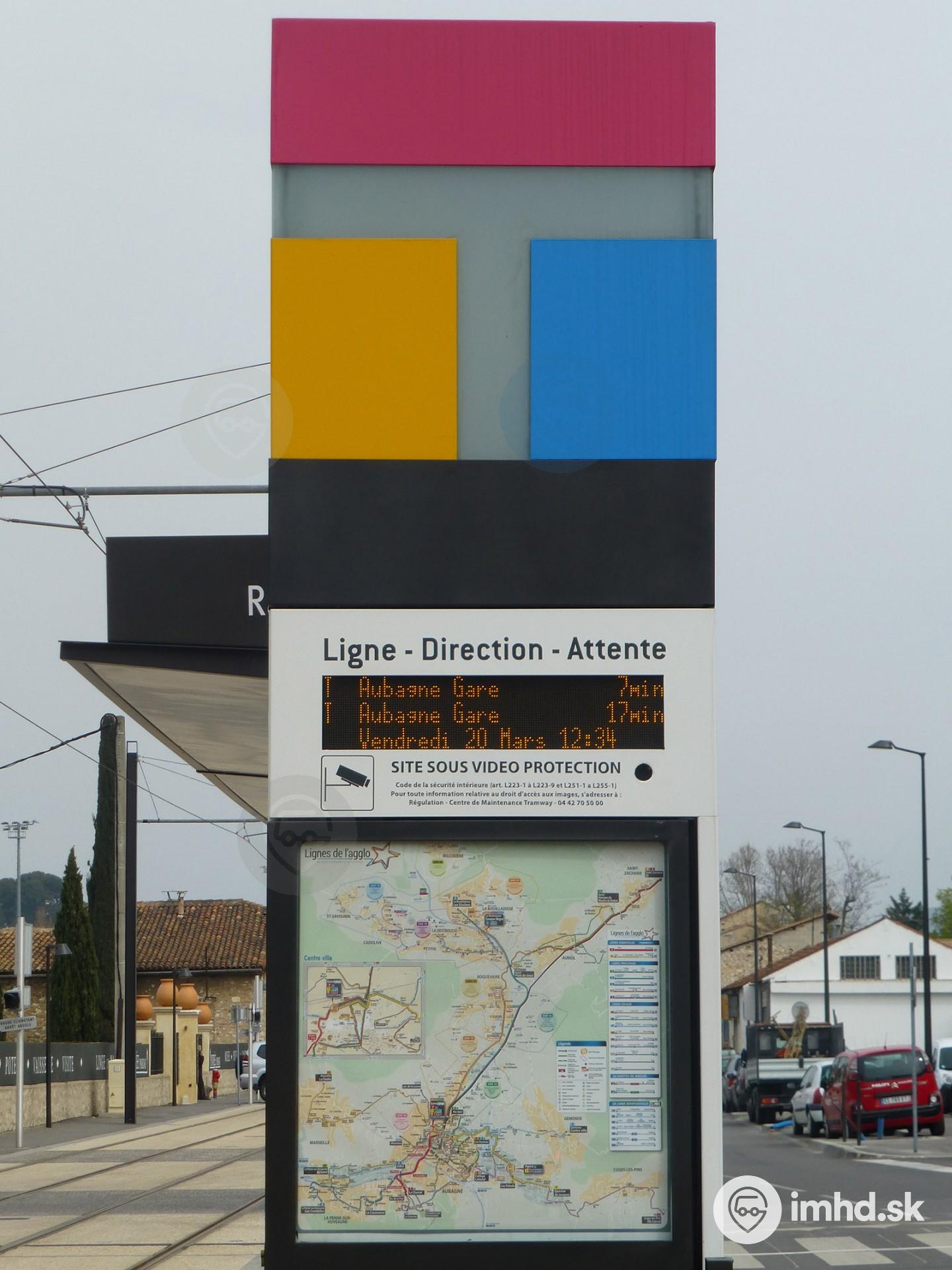 Označník, displej s najbližšími odchodmi a mapa siete Lignes de l'Agglo na zastávke Ravel Decroix.