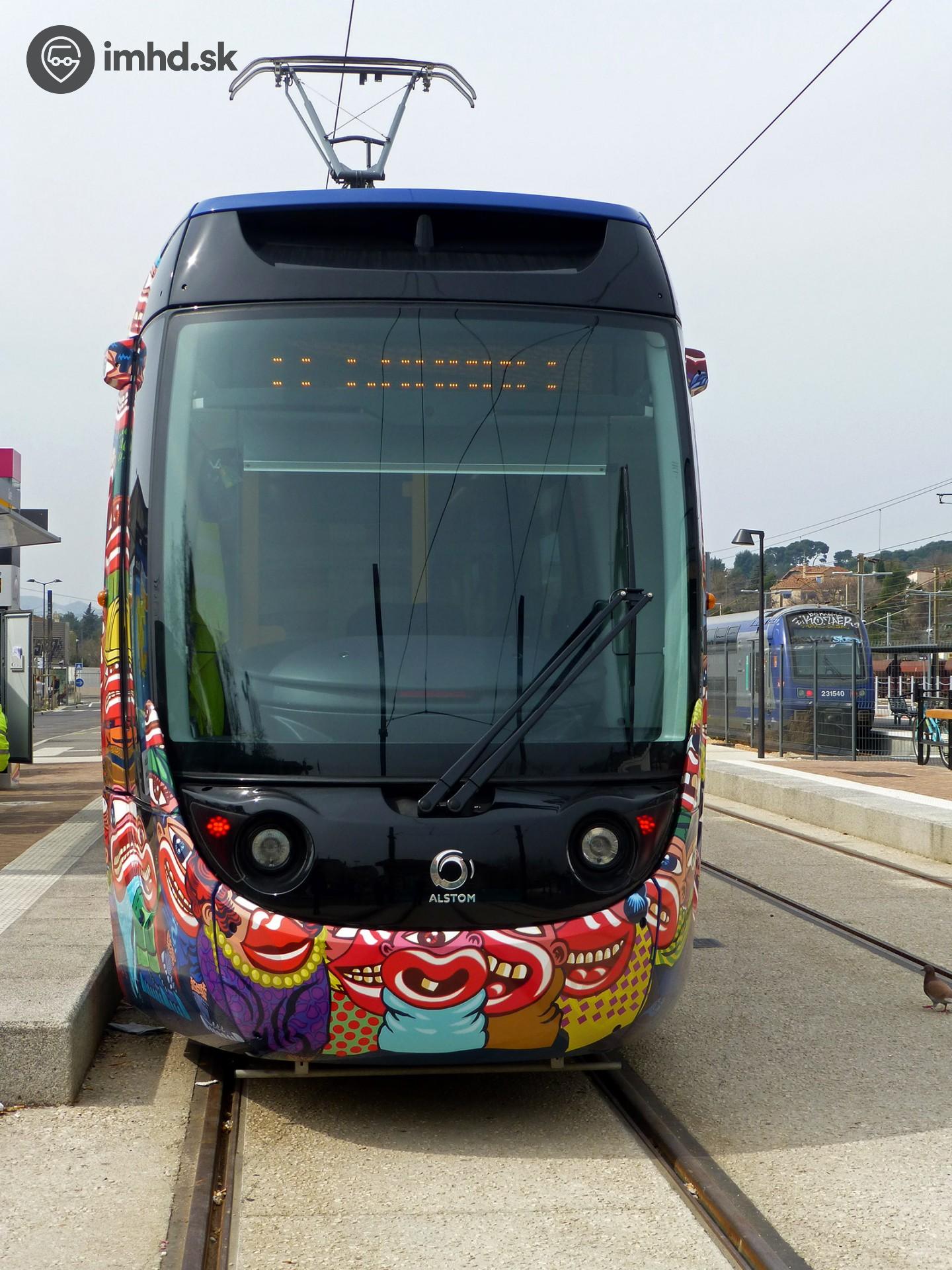 Električka Alstom Citadis Compact na konečnej zastávke Gare s odstaveným poschodovým prímestským vlakom v pozadí. Električka Alstom Citadis Compact vznikla ako krátka verzia modelu Citadis 202 (Melbourne) a je určená pre menšie električkové prevádzky.