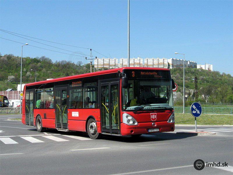 Spoj linky 3 vychádza z parkoviska pred hypermarketom TESCO. V pozadí vidno typickú považsko-bystrickú panorámu - Sídlisko Rozkvet.