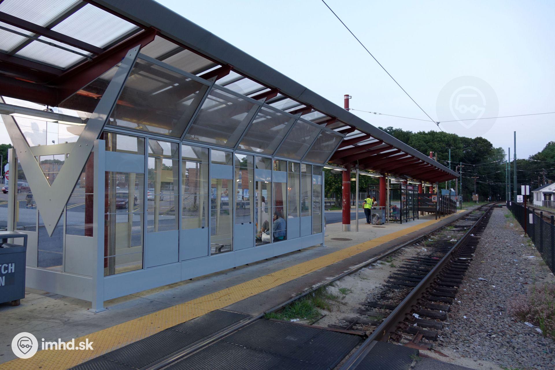 Prestupný uzol Mattapan medzi električkami a autobusmi.