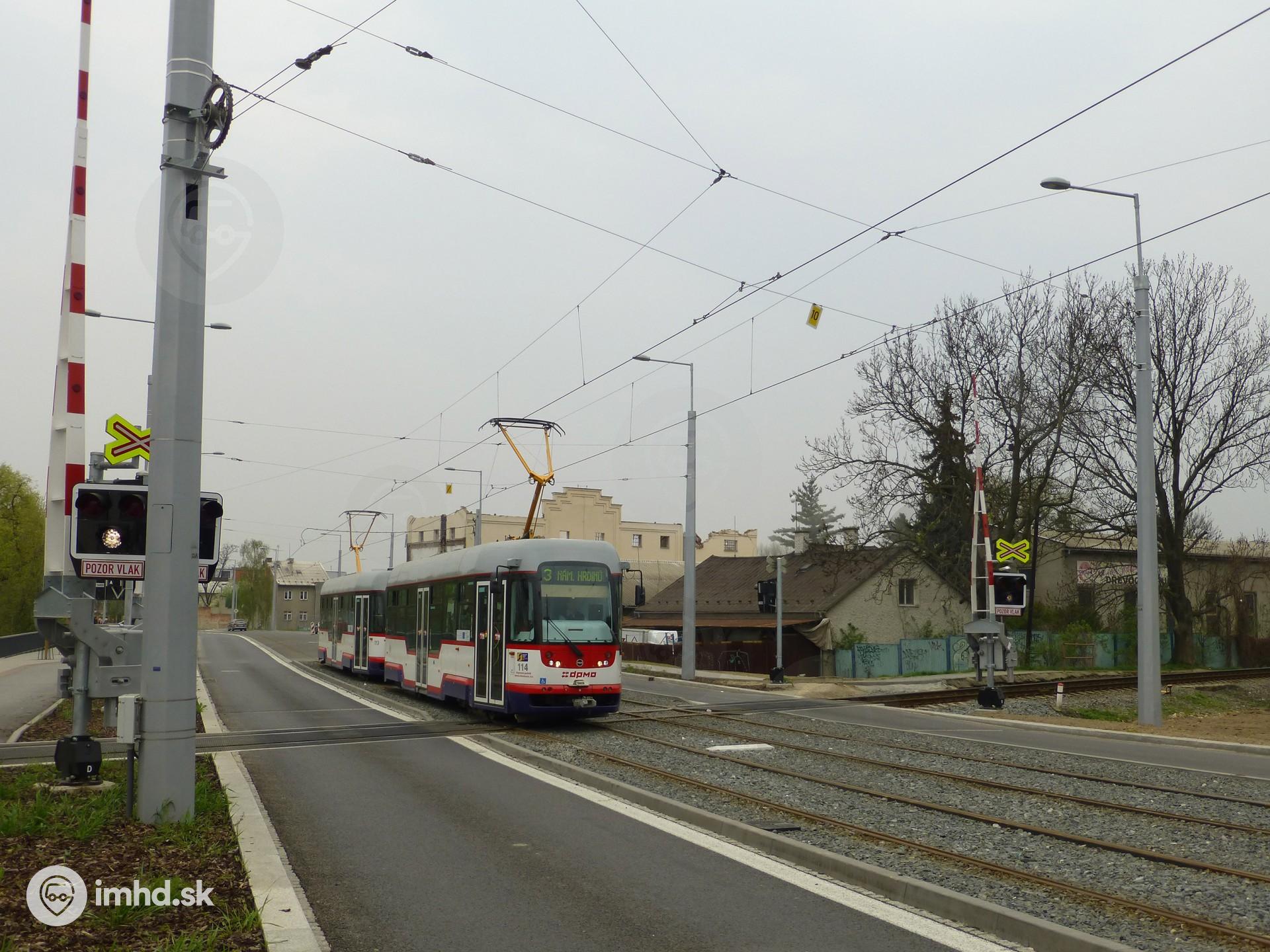 Súprava električiek VarioLF+/o #113+114 prechádza cez kríženie so železničnou traťou pri OC Šantovka.
