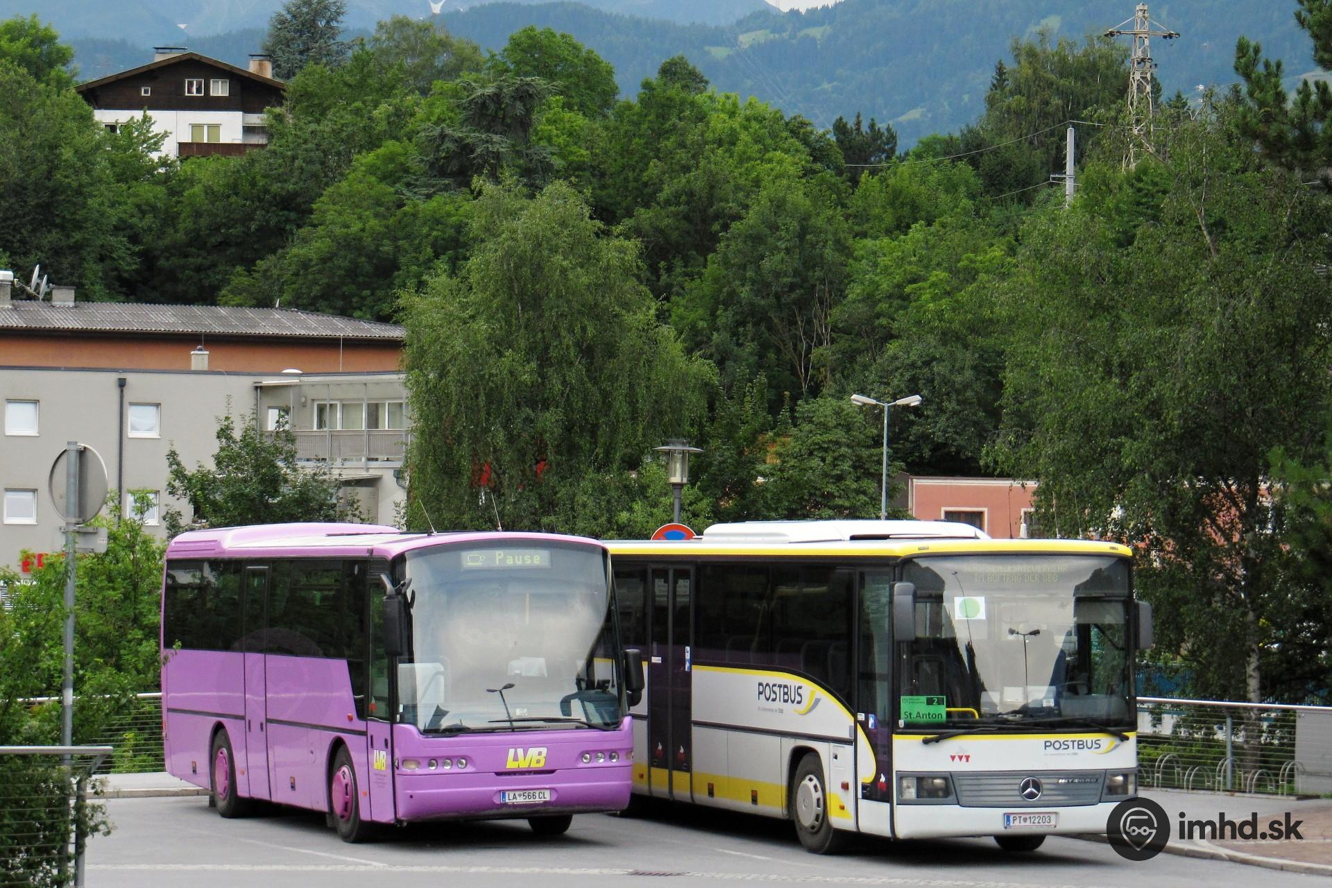 Neoplan Euroliner N 312 K dopravcu LVB a Mercedes-Benz O 550 Integro Postbusu prestávkujú v centre Landecka.