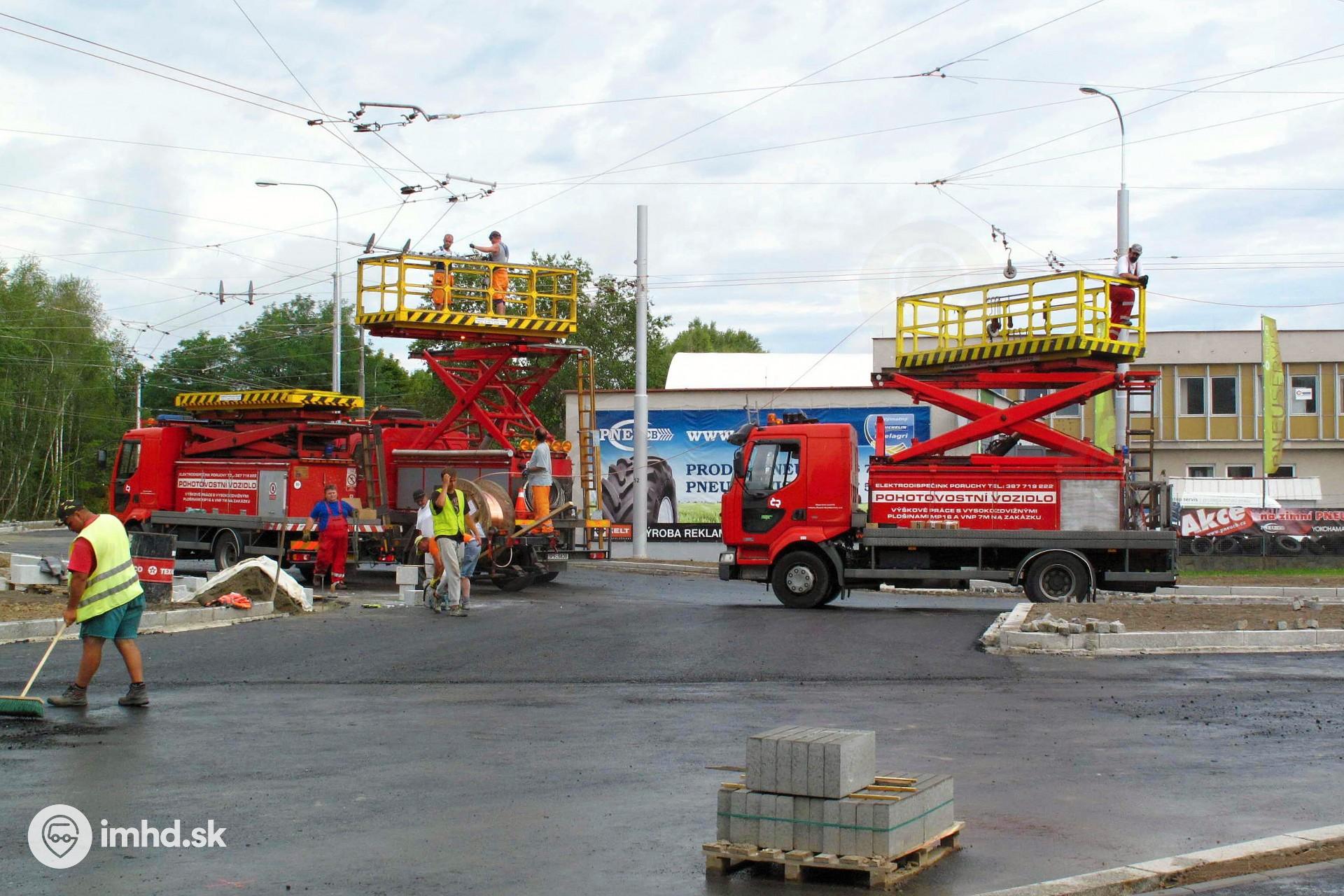 Výstavba nového trolejového vedenia v novej križovatke.