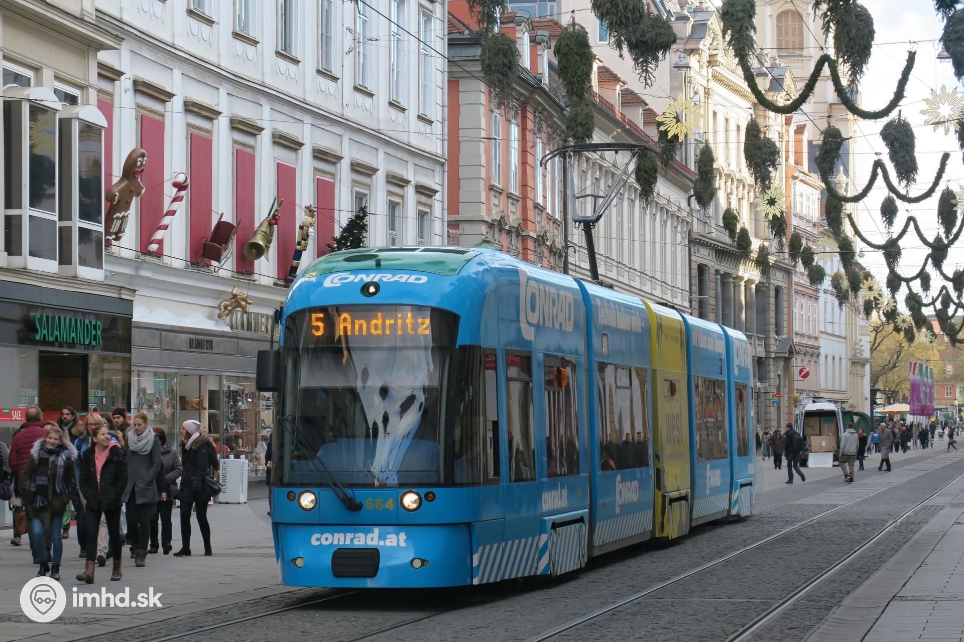 Električka Bombardier Cityrunner #664 na vyzdobenej Herrengasse v historickom centre Grazu.