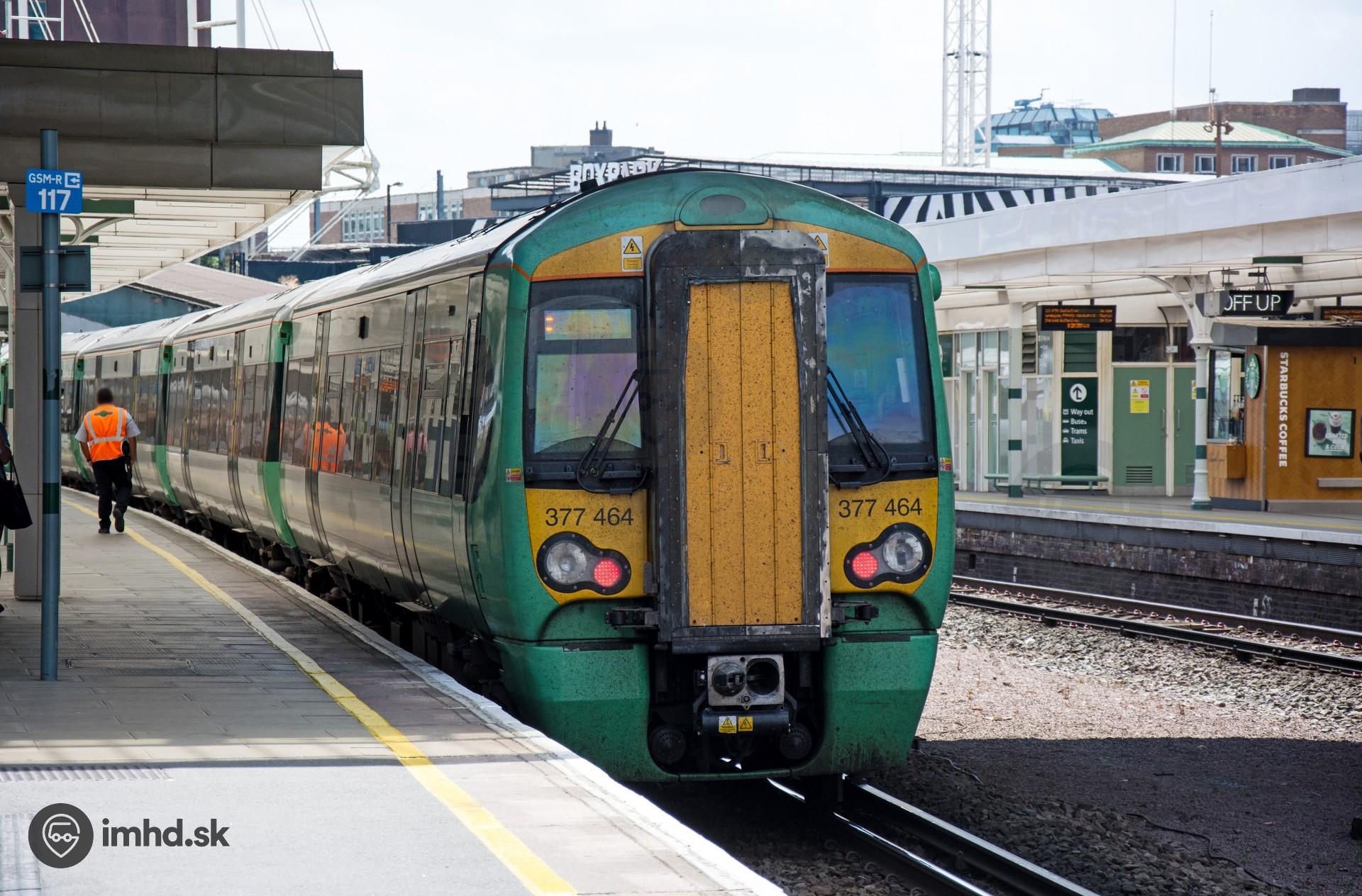 | Súprava zložená z viacerých jednotiek rady 377 Electrostar odchádza zo stanice East Croydon smerom na Brighton. Vďaka dverám na čele jednotky, sú súpravy vytvorené týmito jednotkami plne prechodné. | |