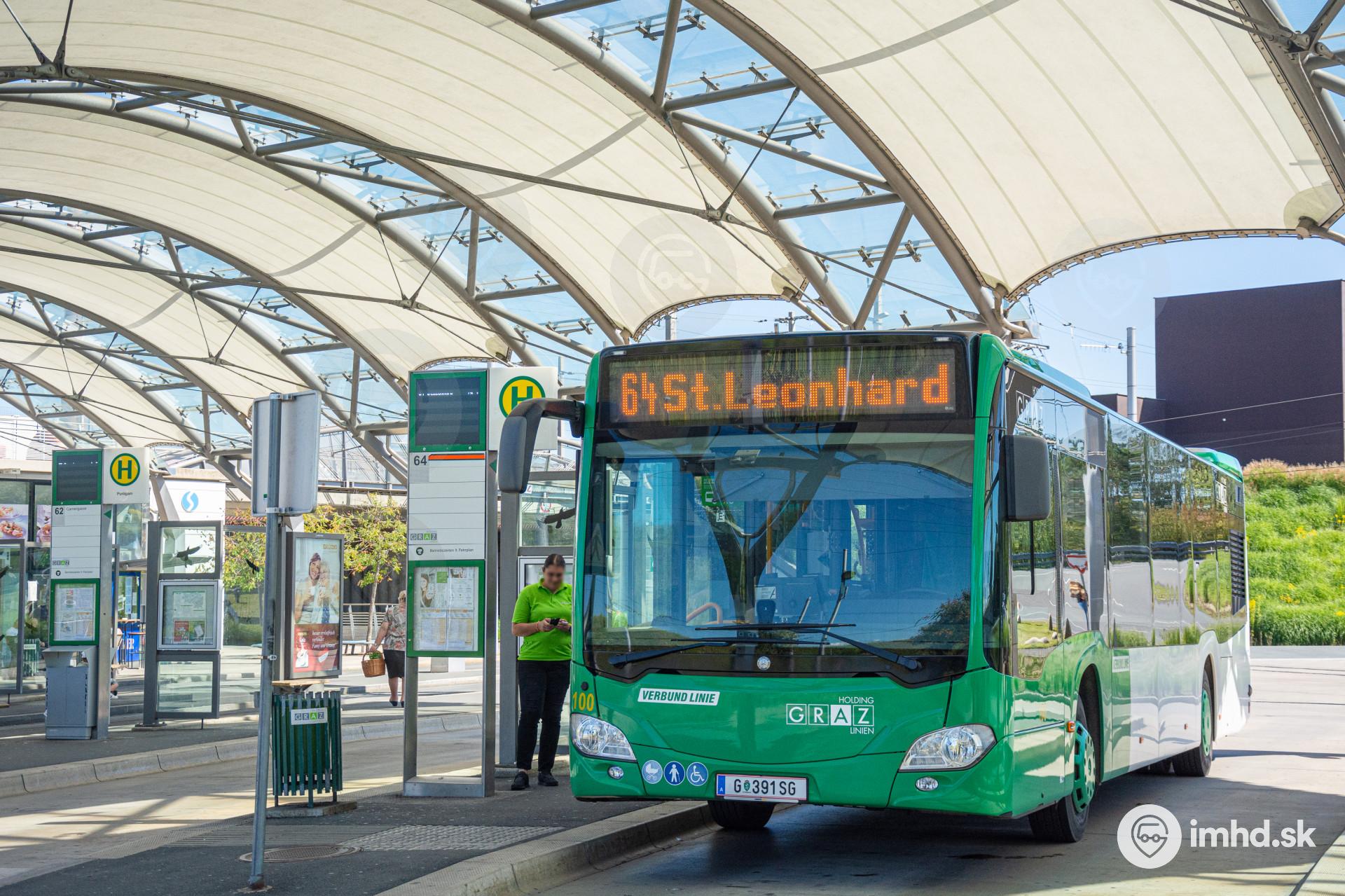 Mercedes-Benz Citaro C2 #100 stojí v prestupnom termináli Puntigam Bahnhof.
