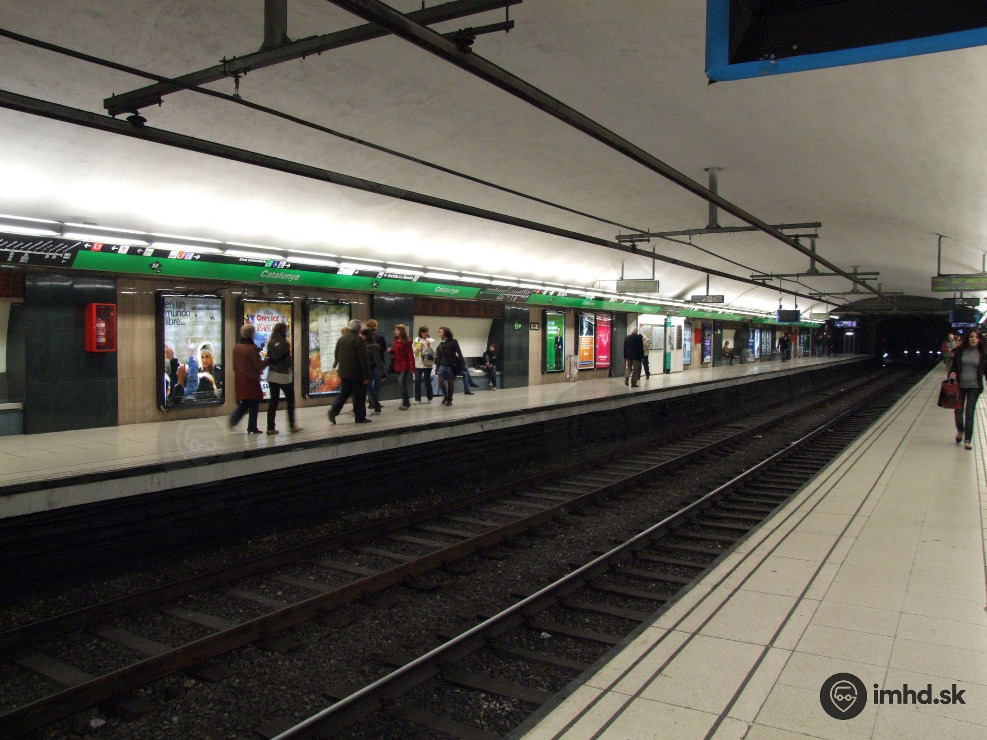 Stanica Plaça de Catalunya pre linku L3. Sieť metra je vybudovaná na rozchode 1435 mm s výnimkou linky L1 (1668 mm) a linky L8 (1000 mm).