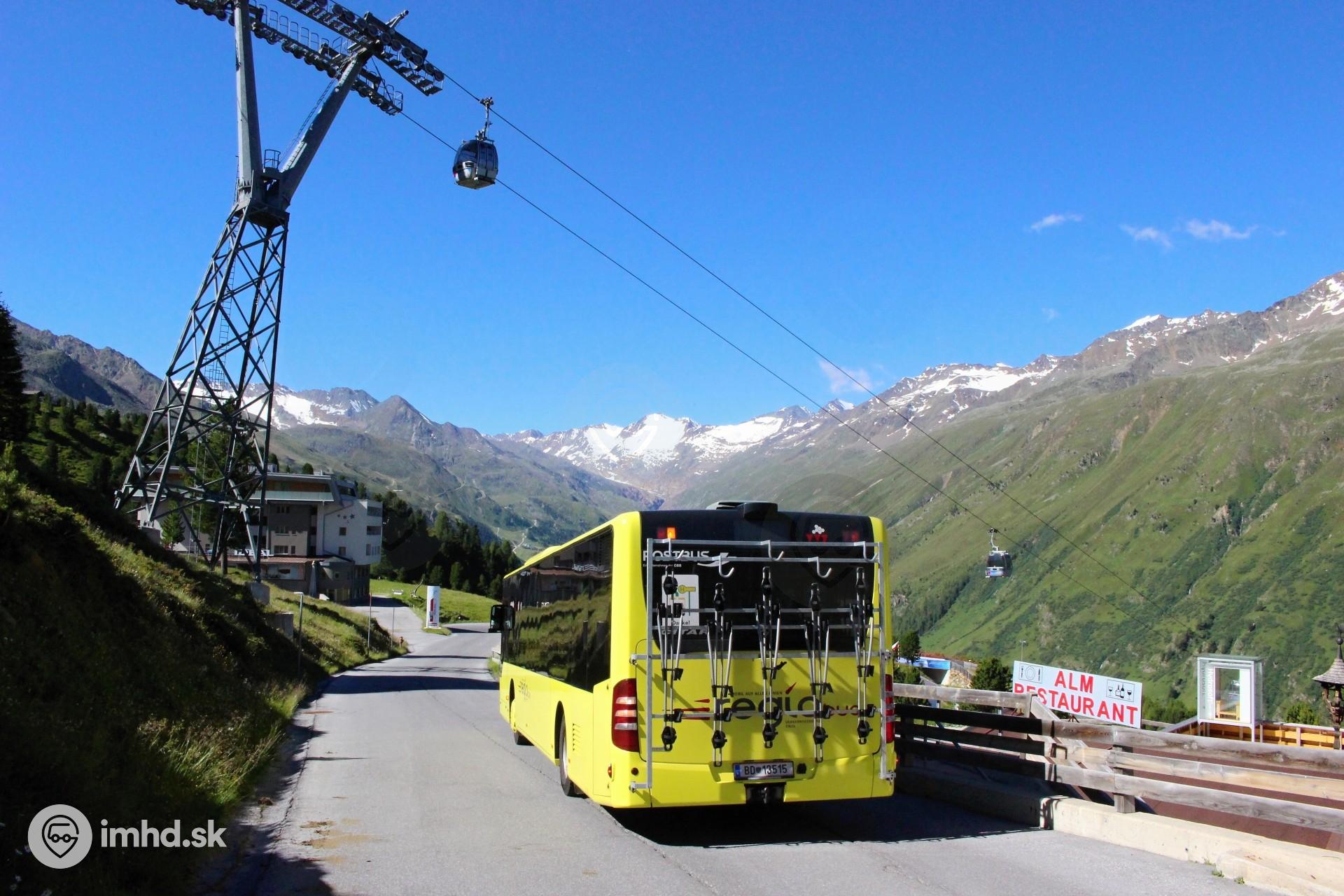 Autobus klesajúci zo sedla Timmelsjoch križuje lanovku Hochgurglbahn v jej strednej stanici.