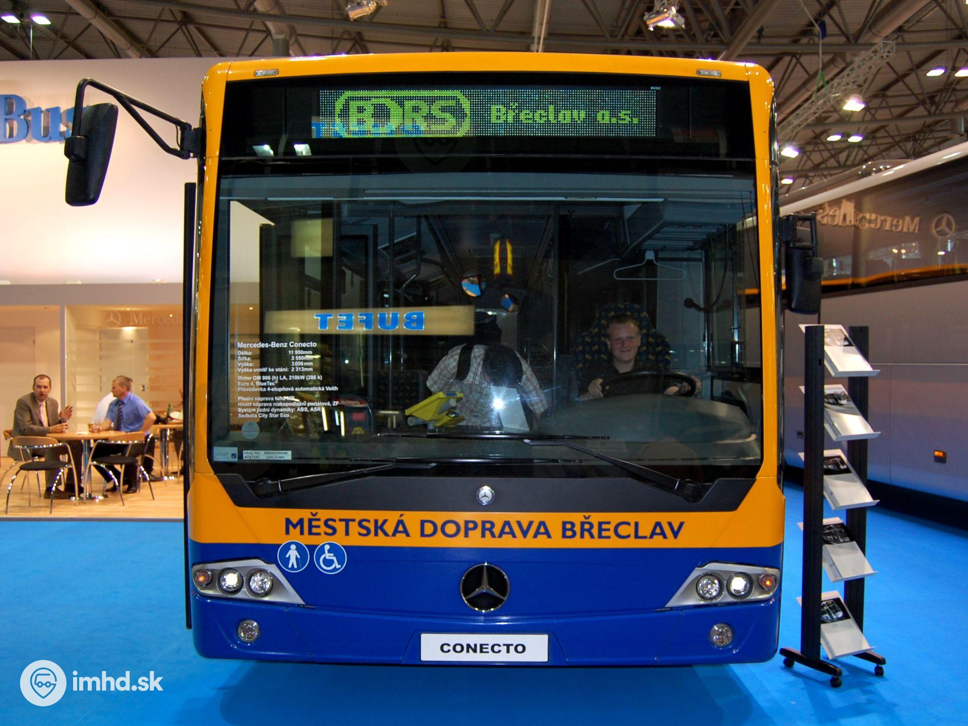 Predné čelo Mercedesu-Benz Conecto v nátere spoločnosti BORS Břeclav a. s. prevádzkujúcej mestskú hromadnú dopravu v spomenutom meste.