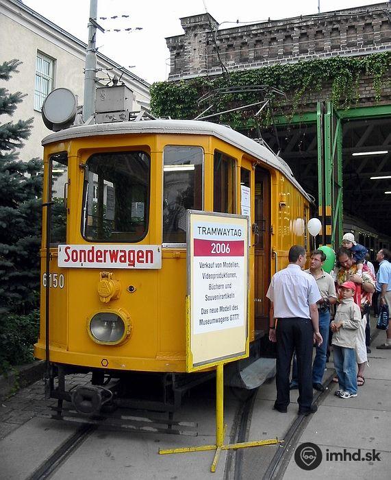 Revízny vozeň MR #6150 používaný revíznymi pracovníkmi na revízie elektrických a mechanických častí viedenských električiek. Vozeň vznikol v roku 1972 prestavbou električky typu M #4150 vyrobenej v roku 1929 vagónkou v Simmeringu. Na fotografii zachytený počas Tramwaytagu 2006 vo vozovni Währinger Gürtel. | |