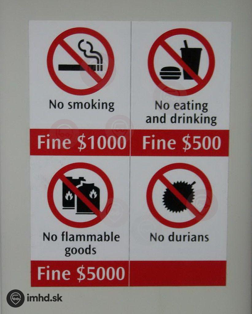 Singapur je mestom/štátom zákazov a vysokých pokút. Zákazy v metre aj s pokutami v singapurských dolároch. Pre našincov - durian je ovocie, ktoré veľmi zapácha.