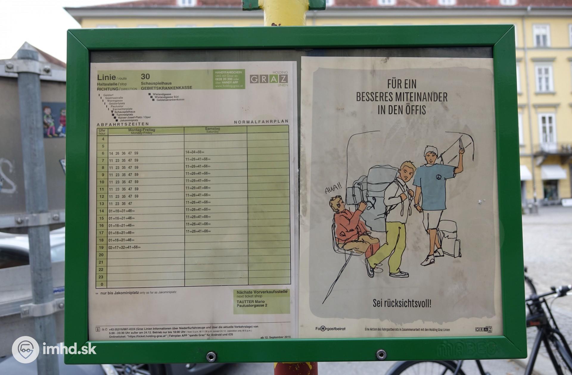 Intervalový cestovný poriadok linky v historickom centre a obrázok vyzývajúci k ohľaduplnosti v MHD.