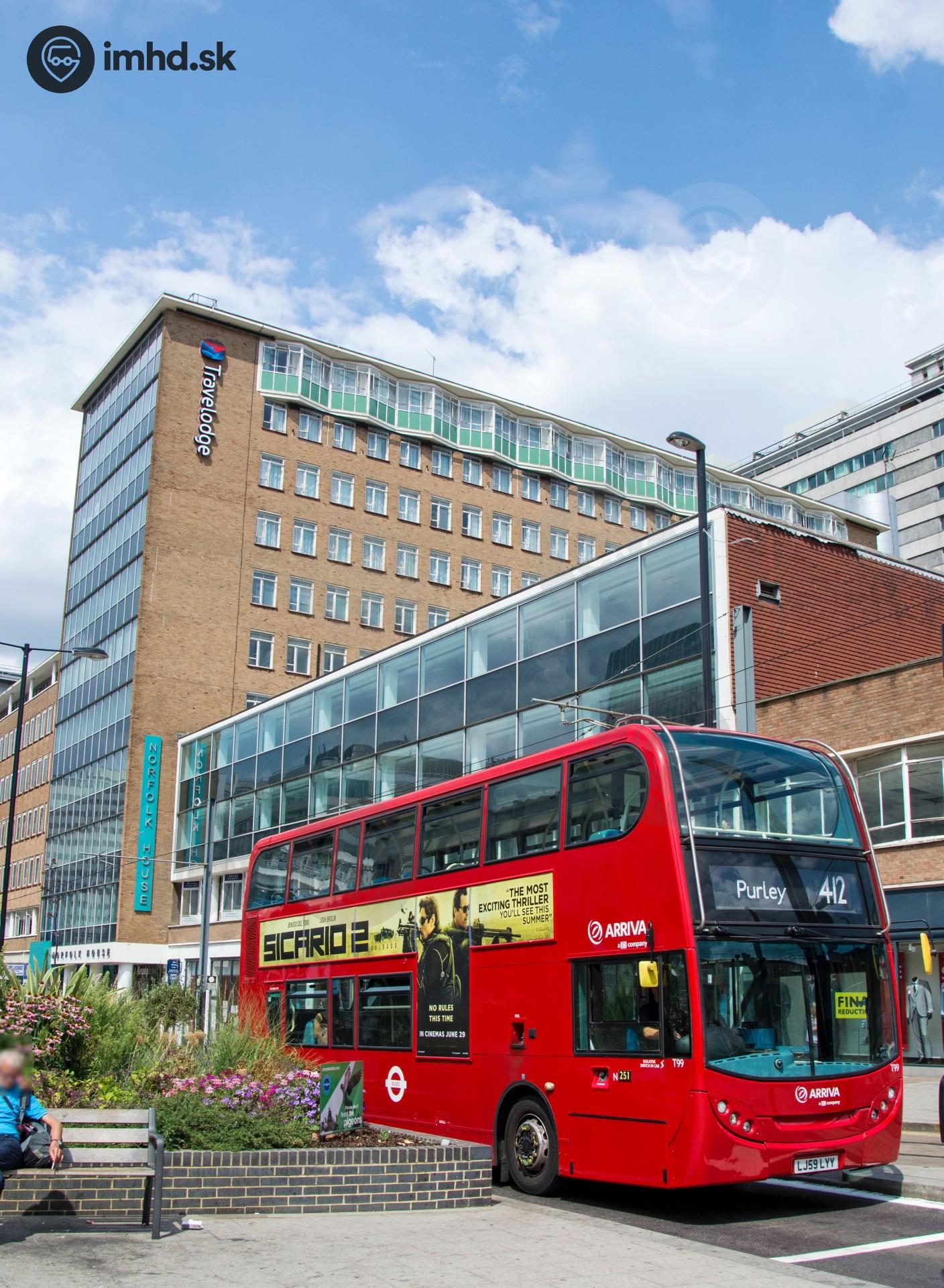 Alexander Dennis Enviro 400 stojí na semafore pred hotelom Travelodge v Croydone. Toto vozidlo vlastní spoločnosť Arriva London South Ltd. a patrí pod vozovňu v Croydone.