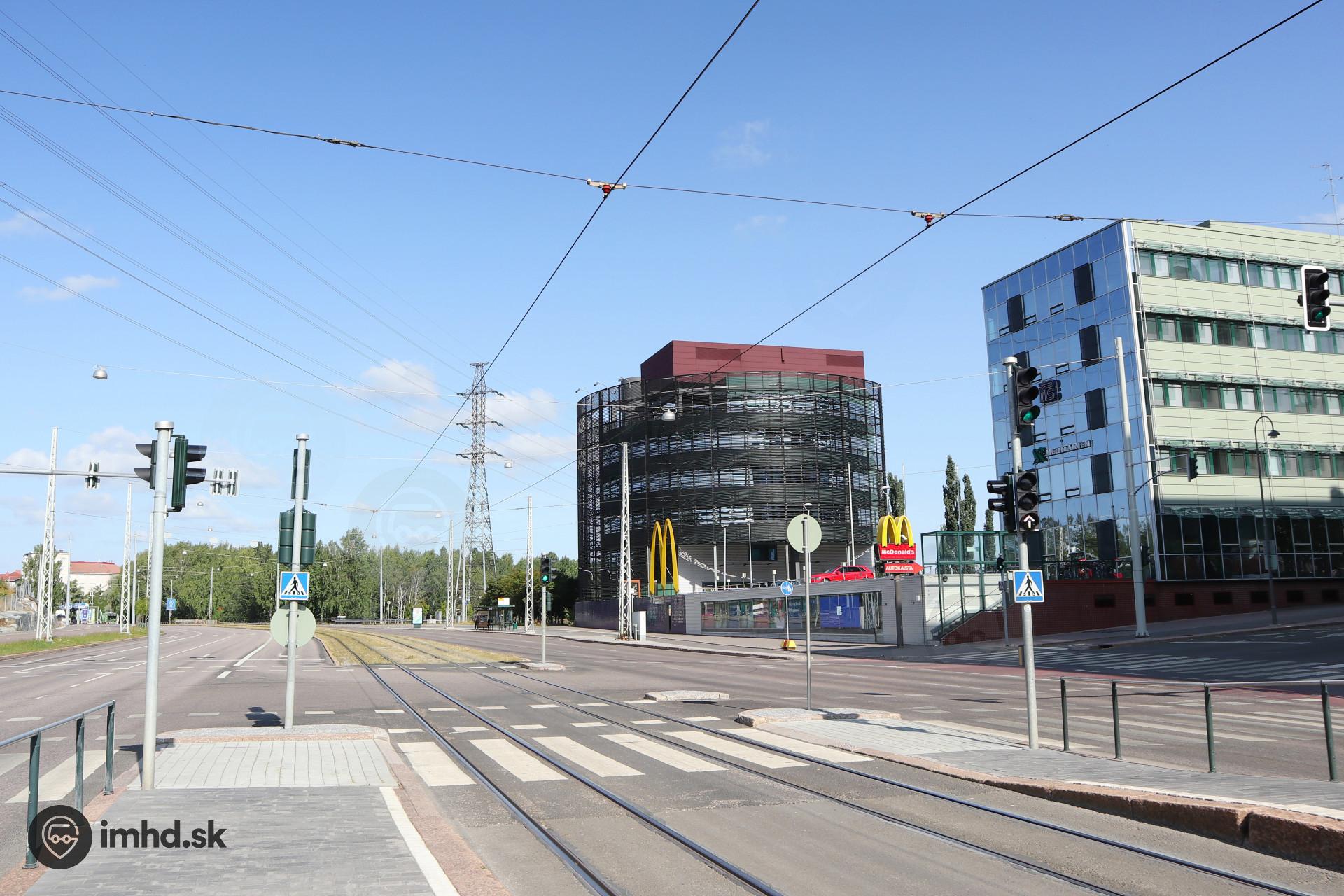 Električková svetelná signalizácia na križovatke električiek a cestnej dopravy pri zastávke Paciuksenkaari.