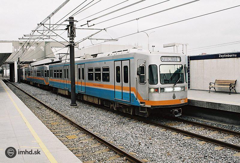 Súprava ľahkého metra na linke Aksaray - Havalimani (Letisko) v stanici Zeytinburnu. Na konci súpravy vozeň #522. Ľahké metro predstavuje najrýchlejší spôsob dopravy z istanbulského medzinárodného letiska do centra mesta.