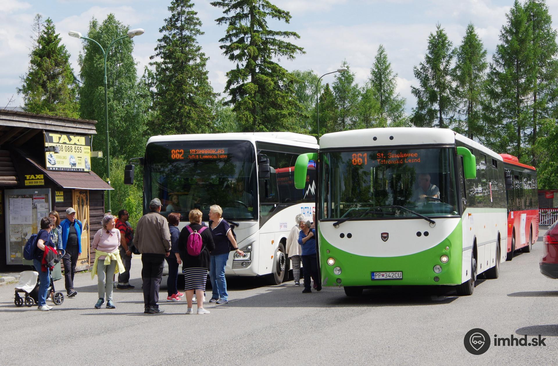 Autobusová stanica v Tatranskej Lomnici plná autobusov jedného dopravcu
