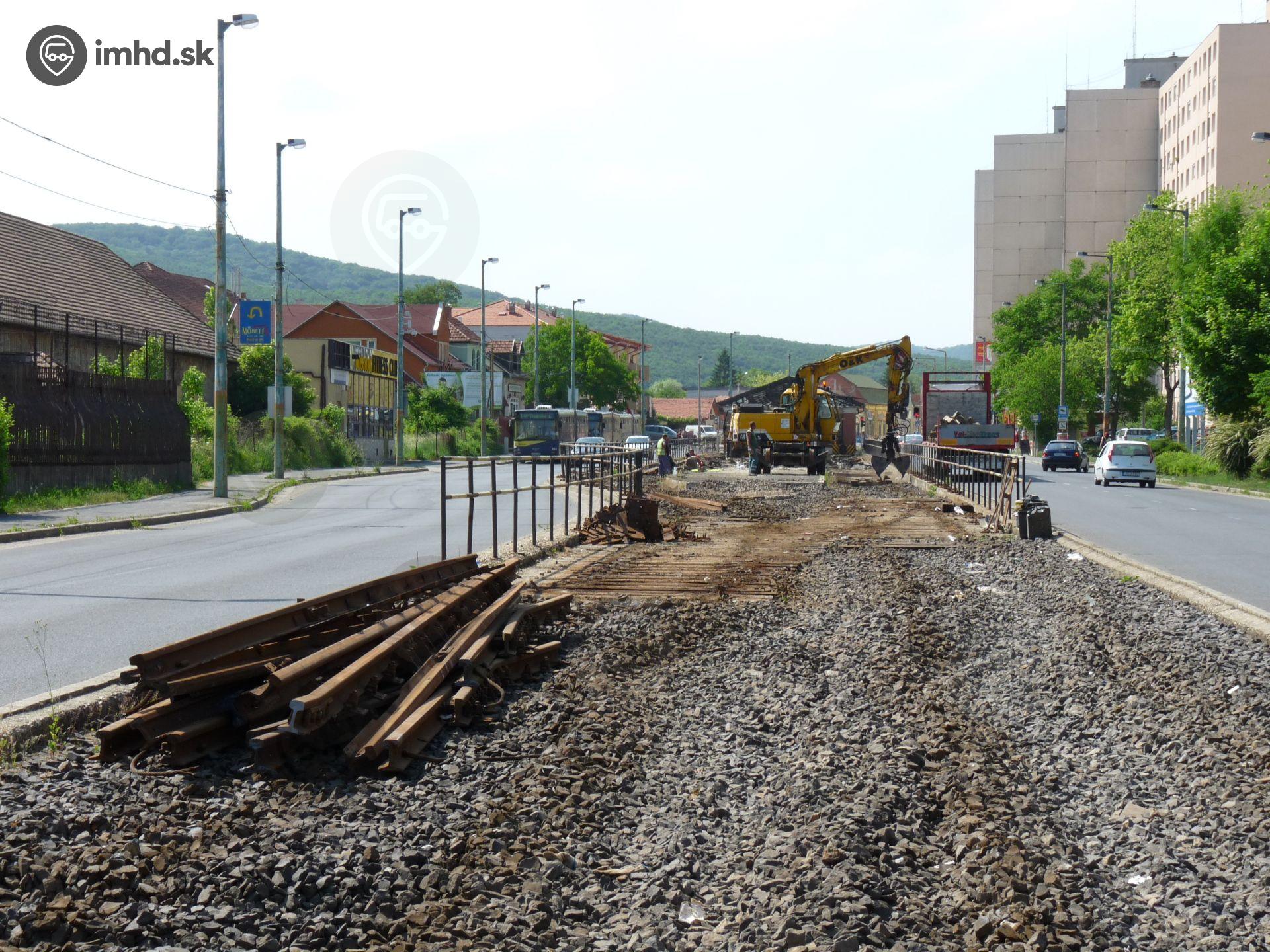 Rozoberanie električkovej trate pred vjazdom na bývalú konečnú Diósgyőr