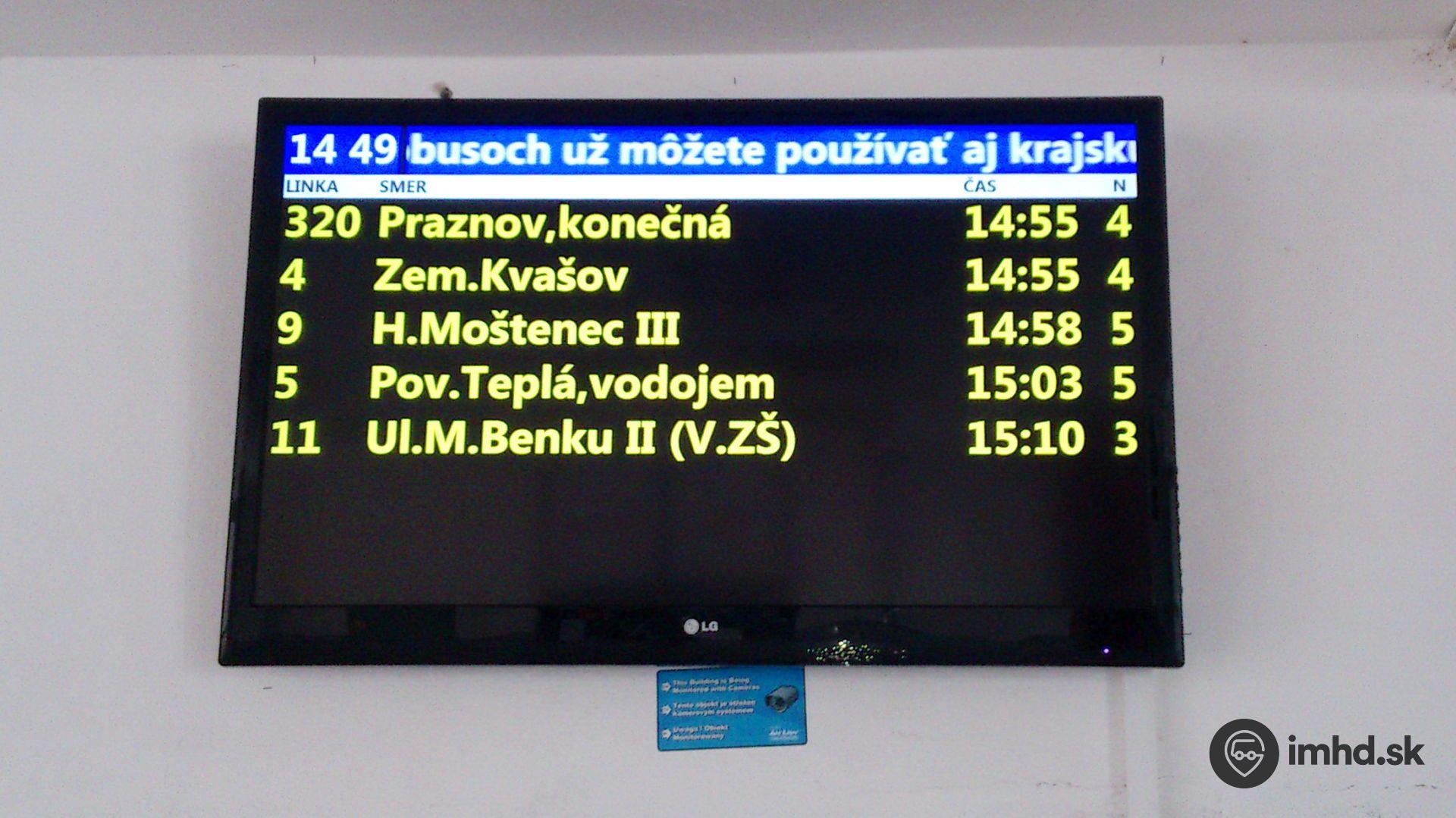 V priestoroch autobusovej stanice sa nachádza aj tabuľa s najbližšími odchodmi liniek MHD