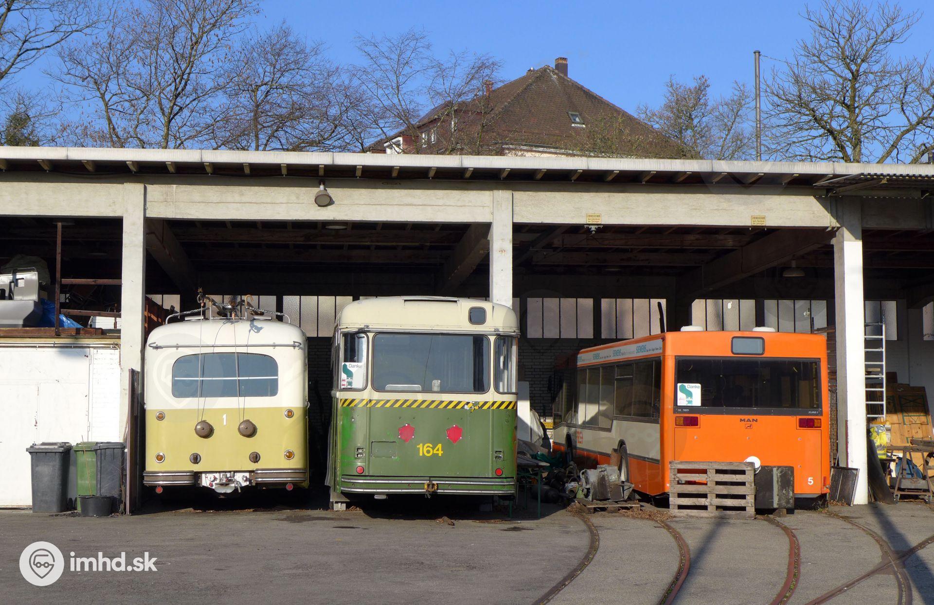 Zachované historické trolejbusy a autobus vo vozovni