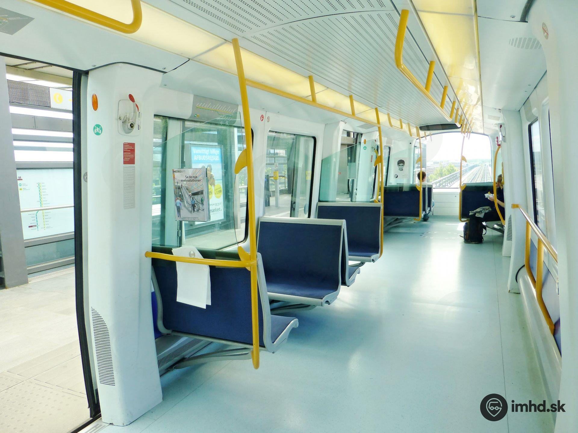 Pohľad na interiér súpravy metra AnsaldoBreda počas prestoja dopravy. Miestnou zaujímavosťou je okrem veľkého priestoru pre kočíky či bicykle rozmiestnenie bielych ekologických igelitových tašiek, použiteľných pre cestujúcich na odpadky, prípadne pri nevoľnosti.