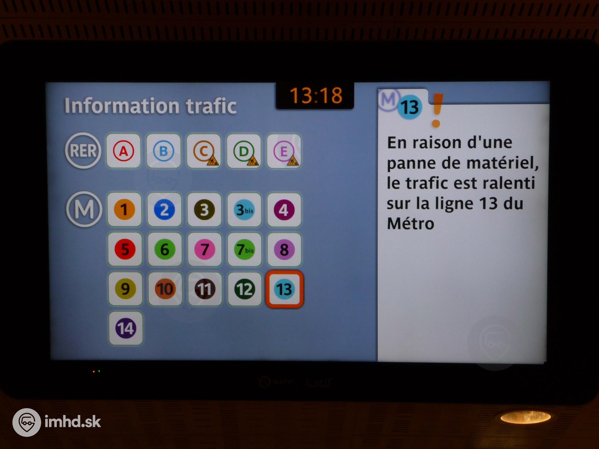 Dopravné informácie na LCD displeji v stanici metra Front Populaire.