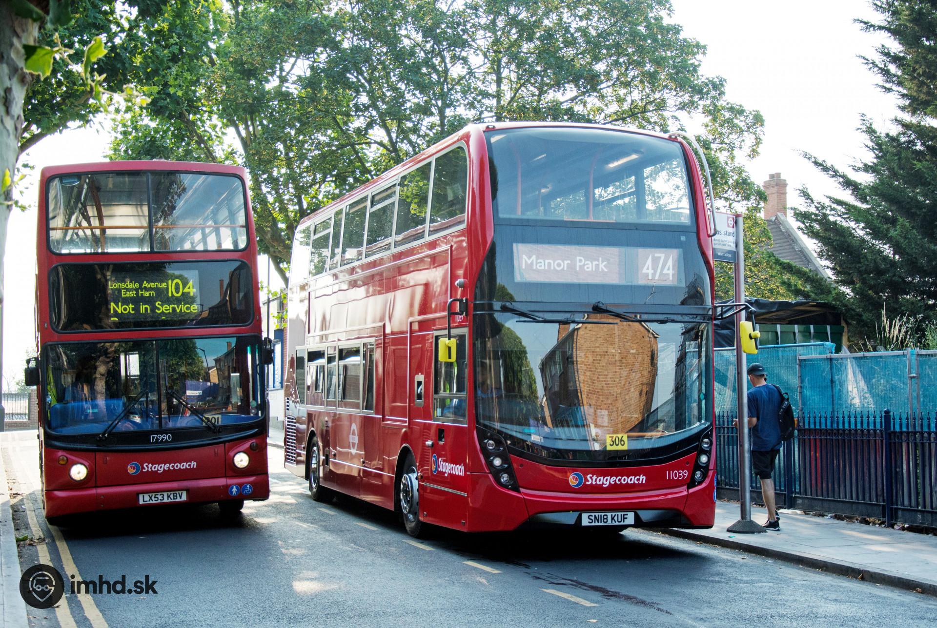 #11039, 17990, LX53 KBV, SN18 KUF, route 104, 474, Whitta Rd, zastávka Manor Park Station