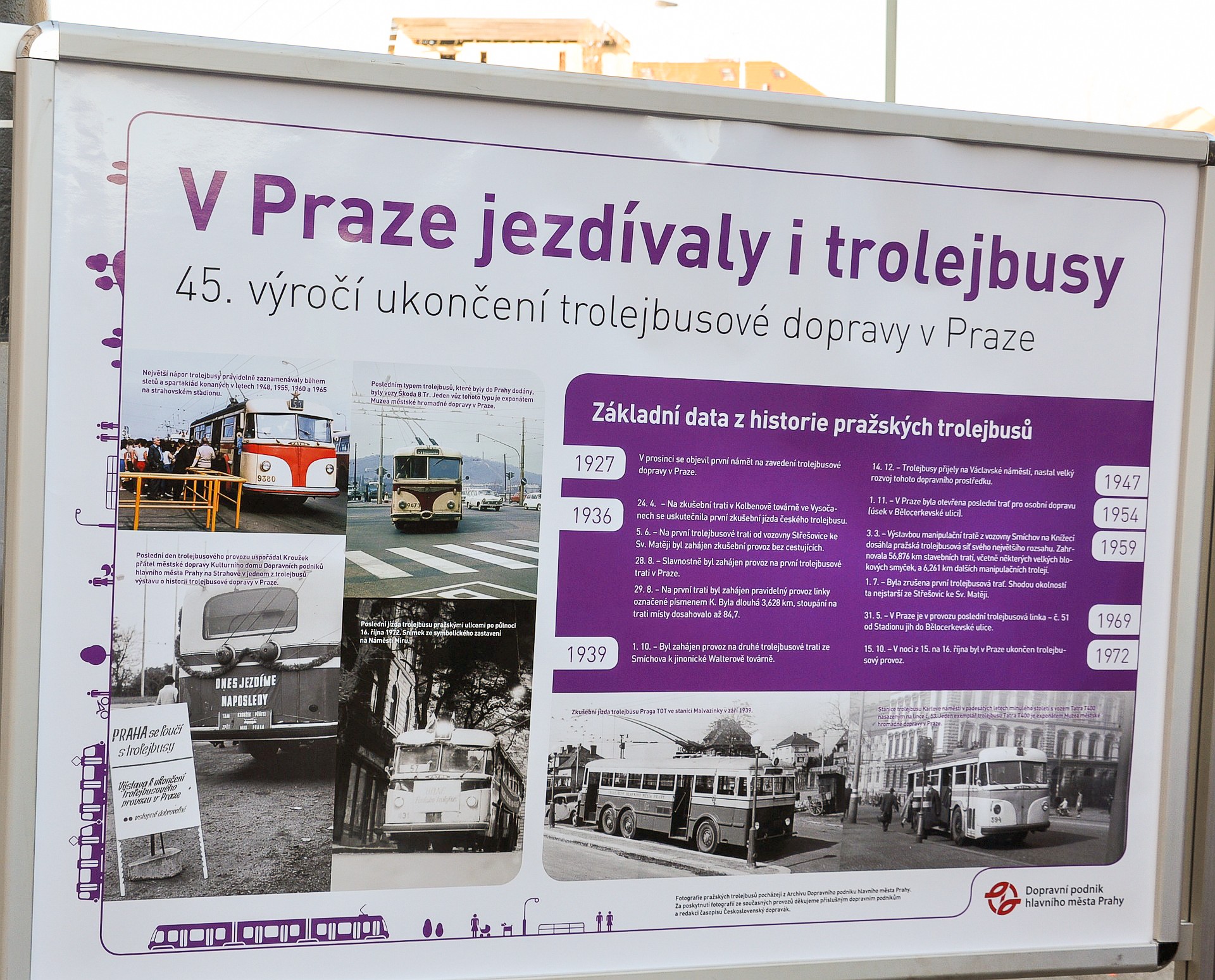 Informačný panel o histórii trolejbusovej dopravy v Prahe.