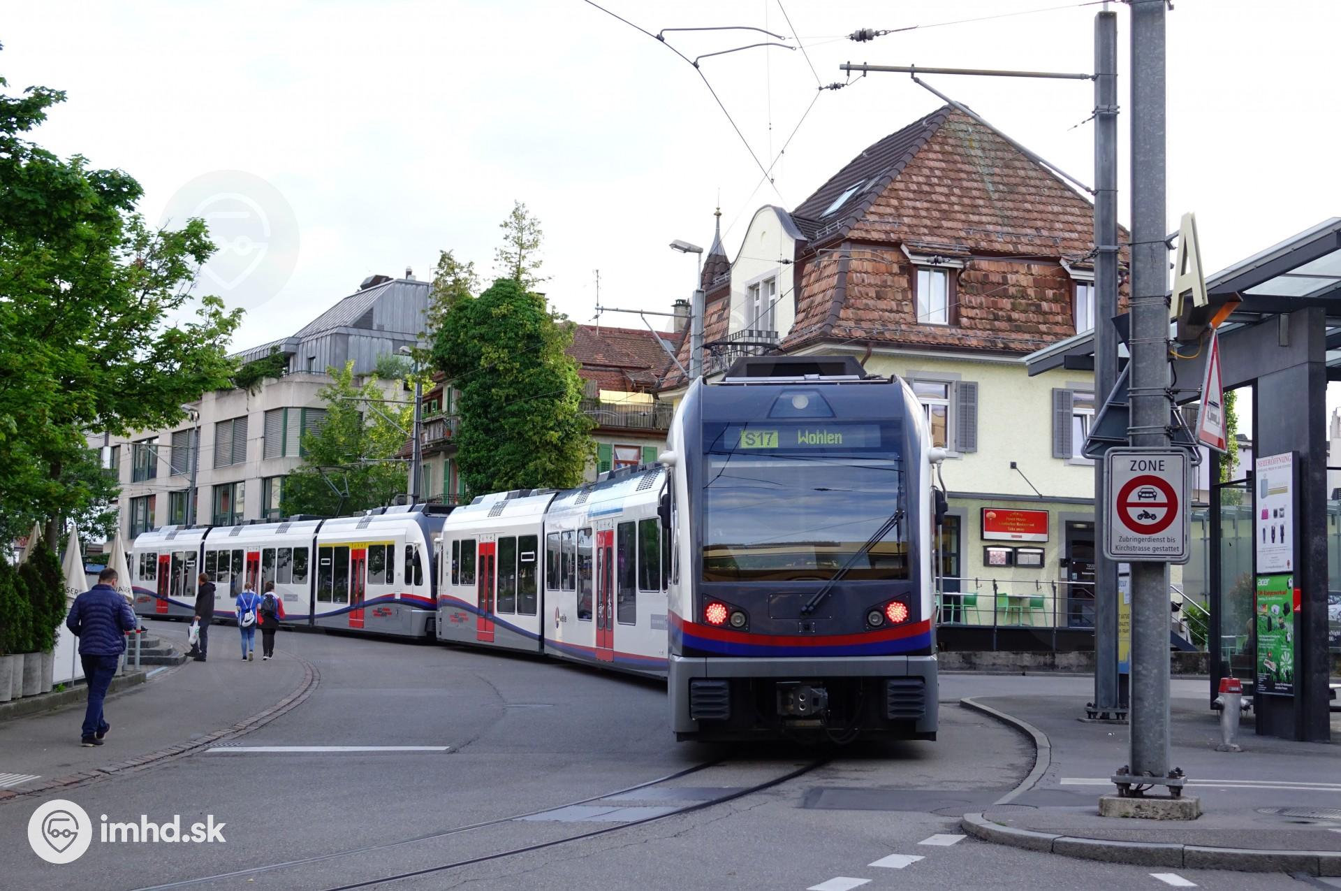 Regionálny vlak tvorený z dvoch jednotiek Stadler Diamant v uliciach mesta Dietikon.