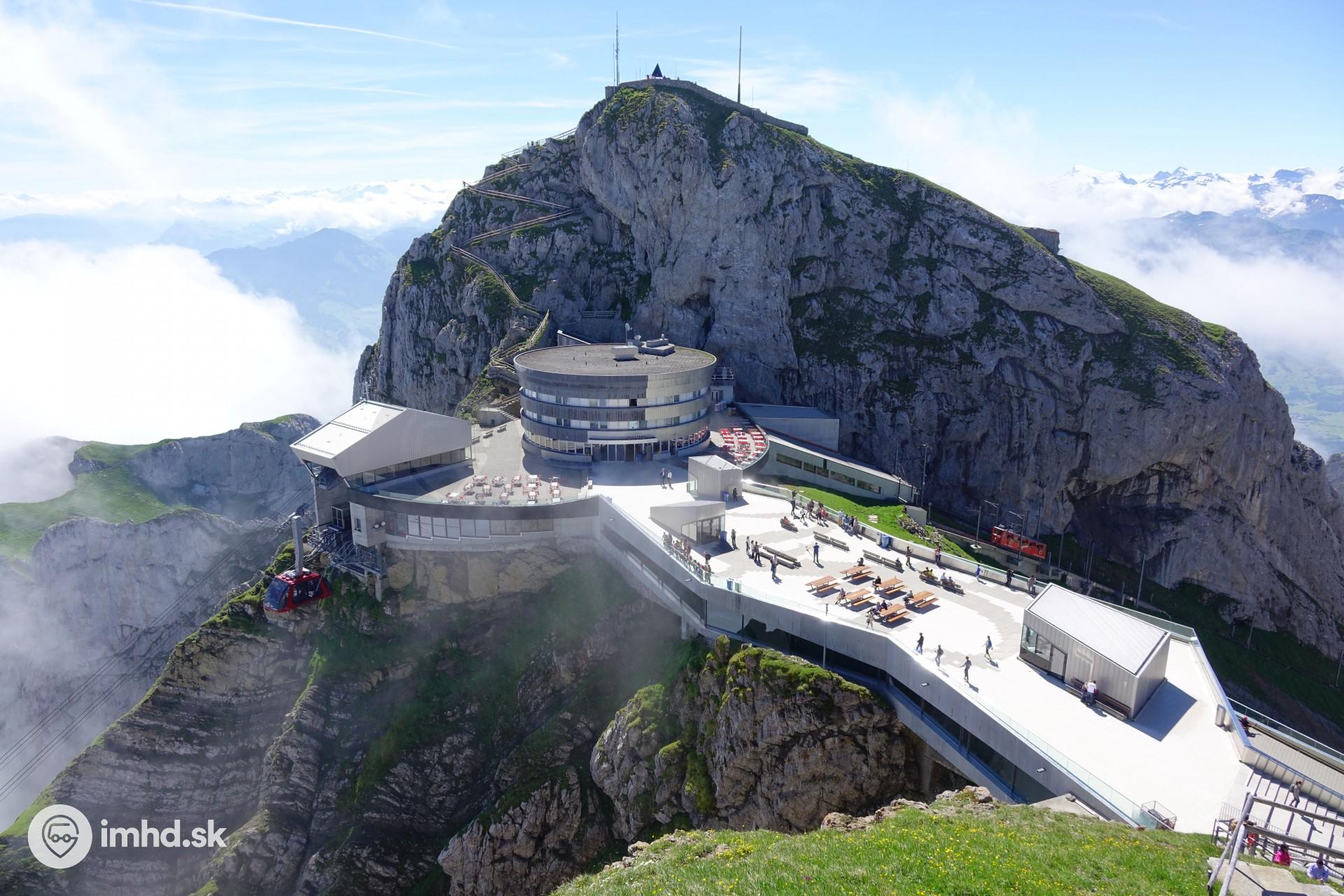 Pod vrcholom Pilatus sa stretáva ozubnicová železnica a visutá lanová dráha.