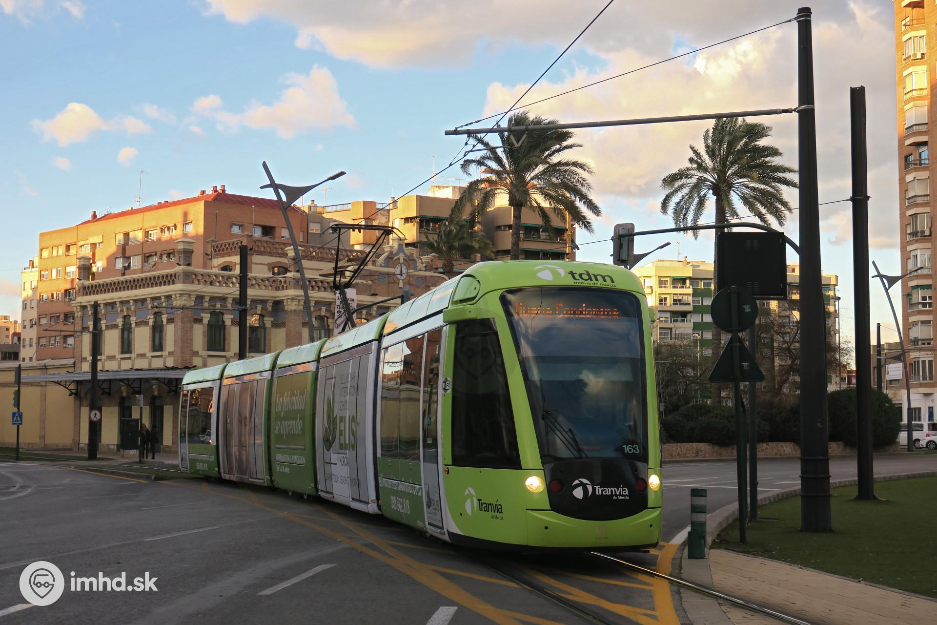 Alstom Citadis 302 #163 na Plaza Circular pred bývalou stanicou lokálnej železnice Murcia - Caravacca, fungujúcej v rokoch 1933 - 1971. Súčasná električková trať vedie čiastočne po jej trase.
