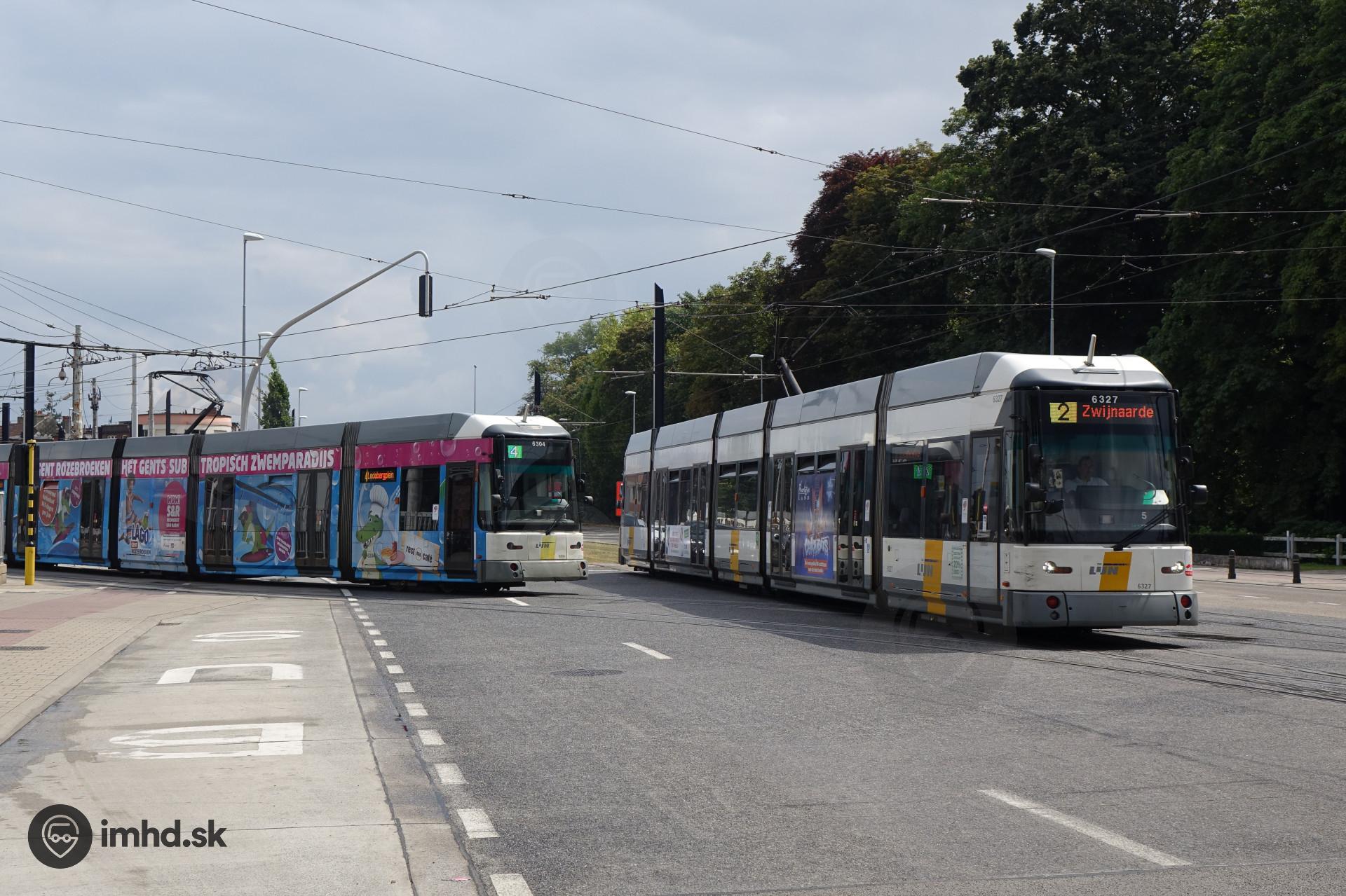 Míňajúce sa električky Bombardier HermeLijn; linka 4 s výlukovou trasou končí vo vozovni