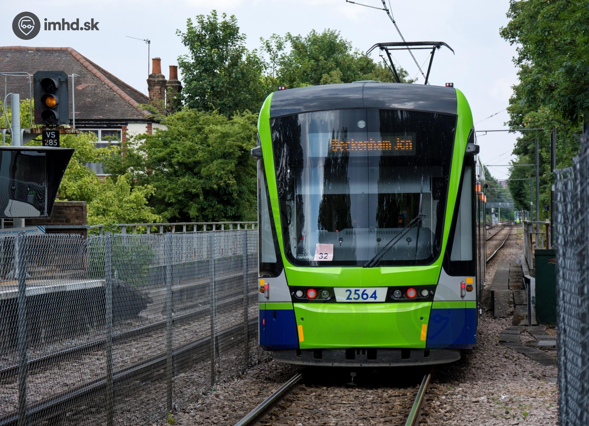 | V rokoch 2012 - 2016 pribudlo do flotily londýnskeho Tramlinku 12 nových električiek Stadler Variobahn. Na fotografii sa Stadler Variobahn #2564 rozbieha zo zastávky Birkbeck, ktorá sa nachádza v jednokoľajnom úseku električkovej trate medzi zastávkami Harrington Road - Avenue Road. Ľavá koľaj je napájaná z tretej koľajnice a slúži mestským vlakom spoločnosti Southern. Taktiež za spomenutie stojí, že od 25.2.2018 električky nepoužívajú číselné označovanie liniek, ich displeje zobrazujú iba cieľovú destináciu. | |