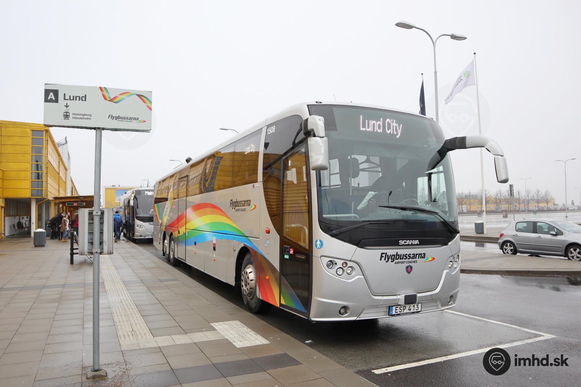 Scania OmniExpress 3.40 #1508 dopravcu Flygbussarna (FAC Airport Coaches AB), ktorý sa špecializuje na autobusové spojenia letísk s mestami v Škandinávii, pred odchodom do Lundu.