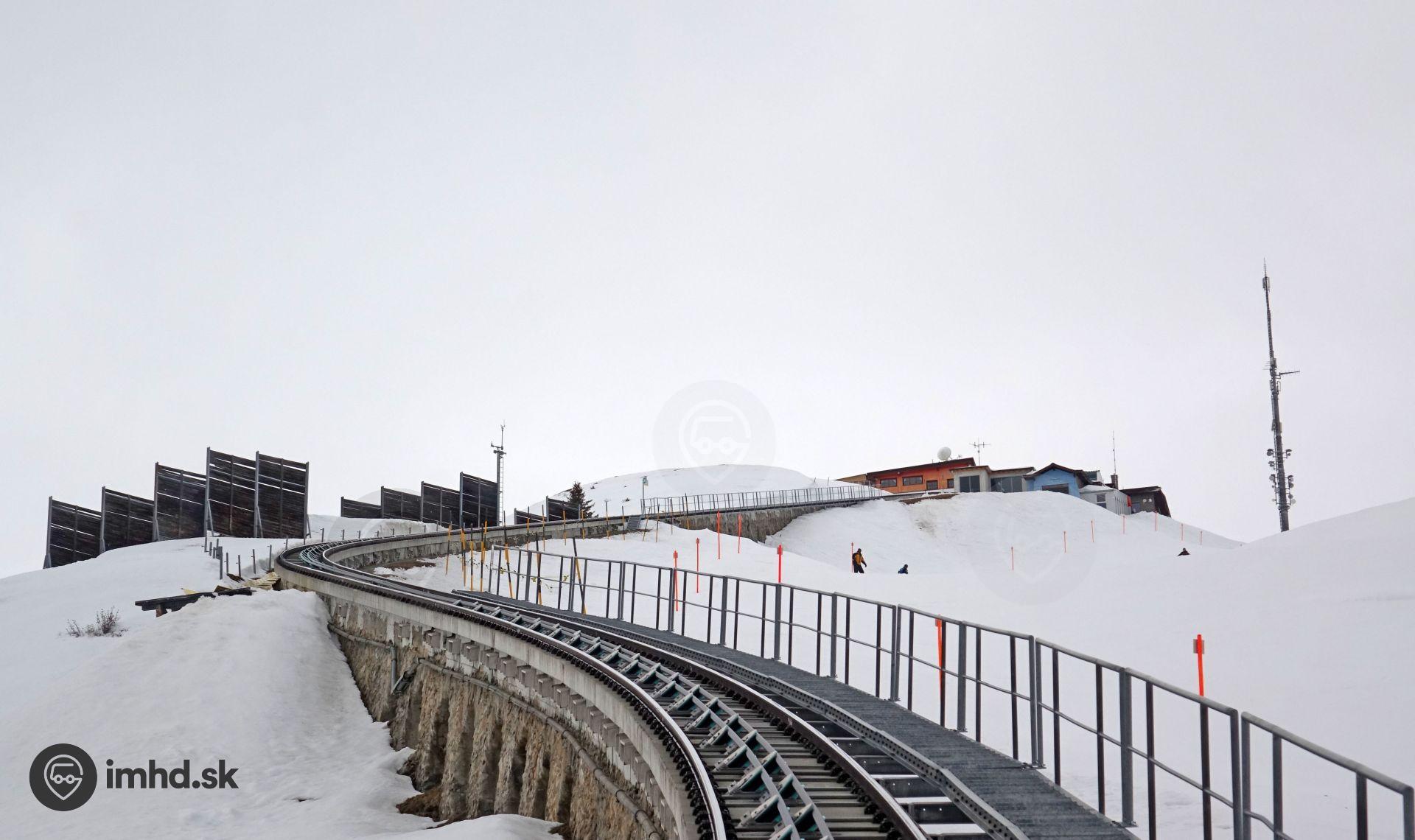 Lanová dráha je rozdelená na dva úseky, na fotografii je pohľad na koniec prvého úseku pred medzistanicou.