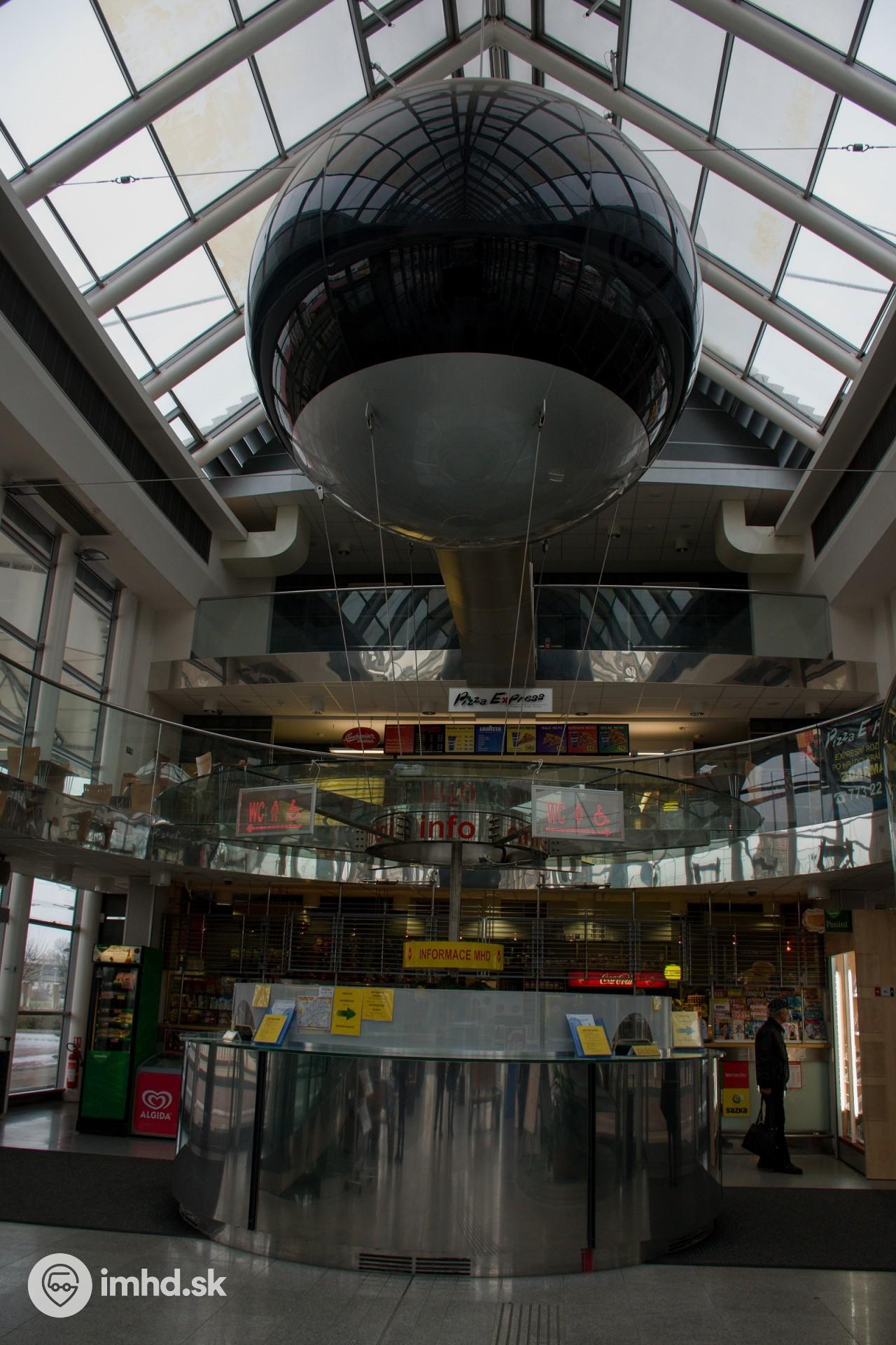 | Interiér terminálu hromadnej dopravy. Dole sa nachádza informačné centrum DPmHK, hore "v guli" je stanovište dispečera. | |