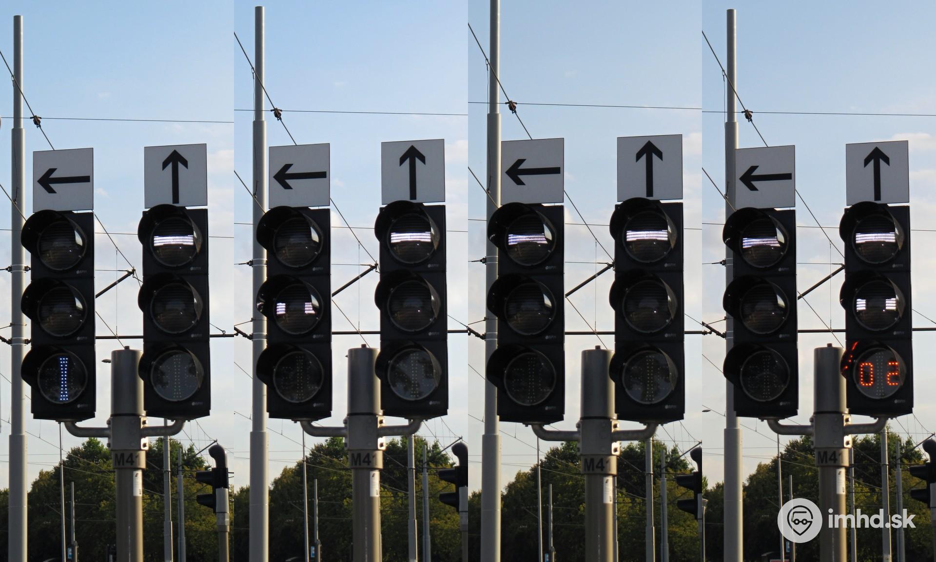 Svetelná signalizácia pre električky na niektorých križovatkách zobrazuje i čas do zmeny signálu (vpravo).